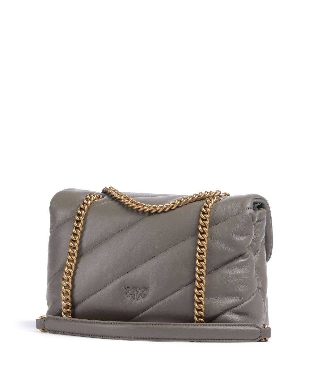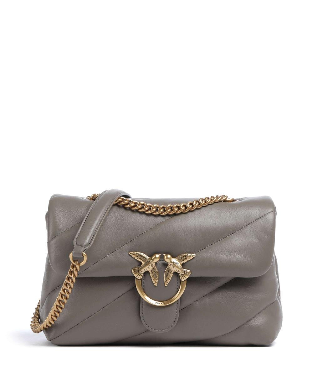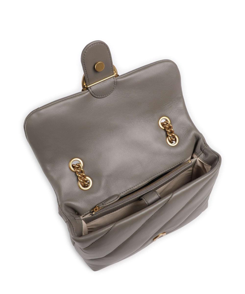 Classic Love Bag Puff in morbida nappa con maxi trapuntatura obliqua. La chiusura è completata dall'iconica fibbia in metallo Love Birds Diamond Cut. L'interno è foderato in microfibra scamosciata e comprende tramezza chiusa con zip e tasca a parete. La tracolla combina la classica catena metallica rotonda al pratico spallaccio in nappa.