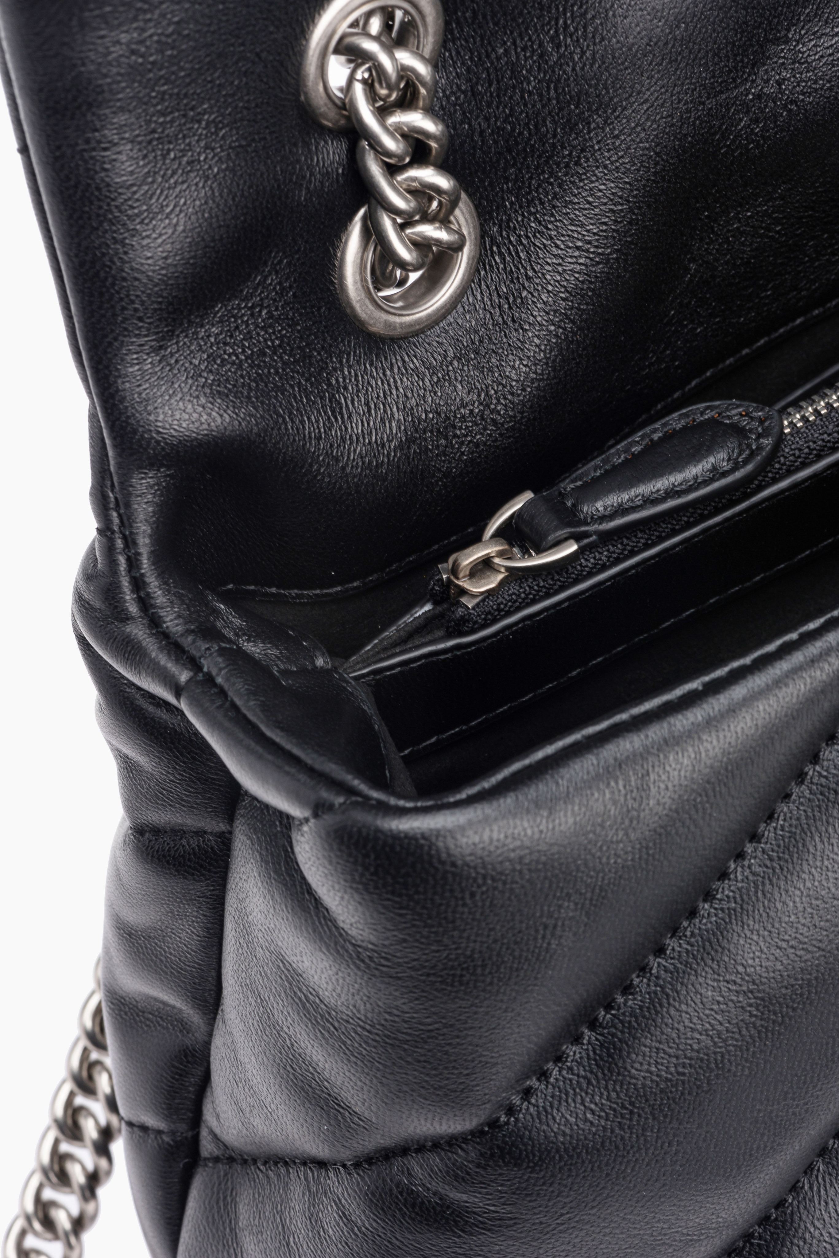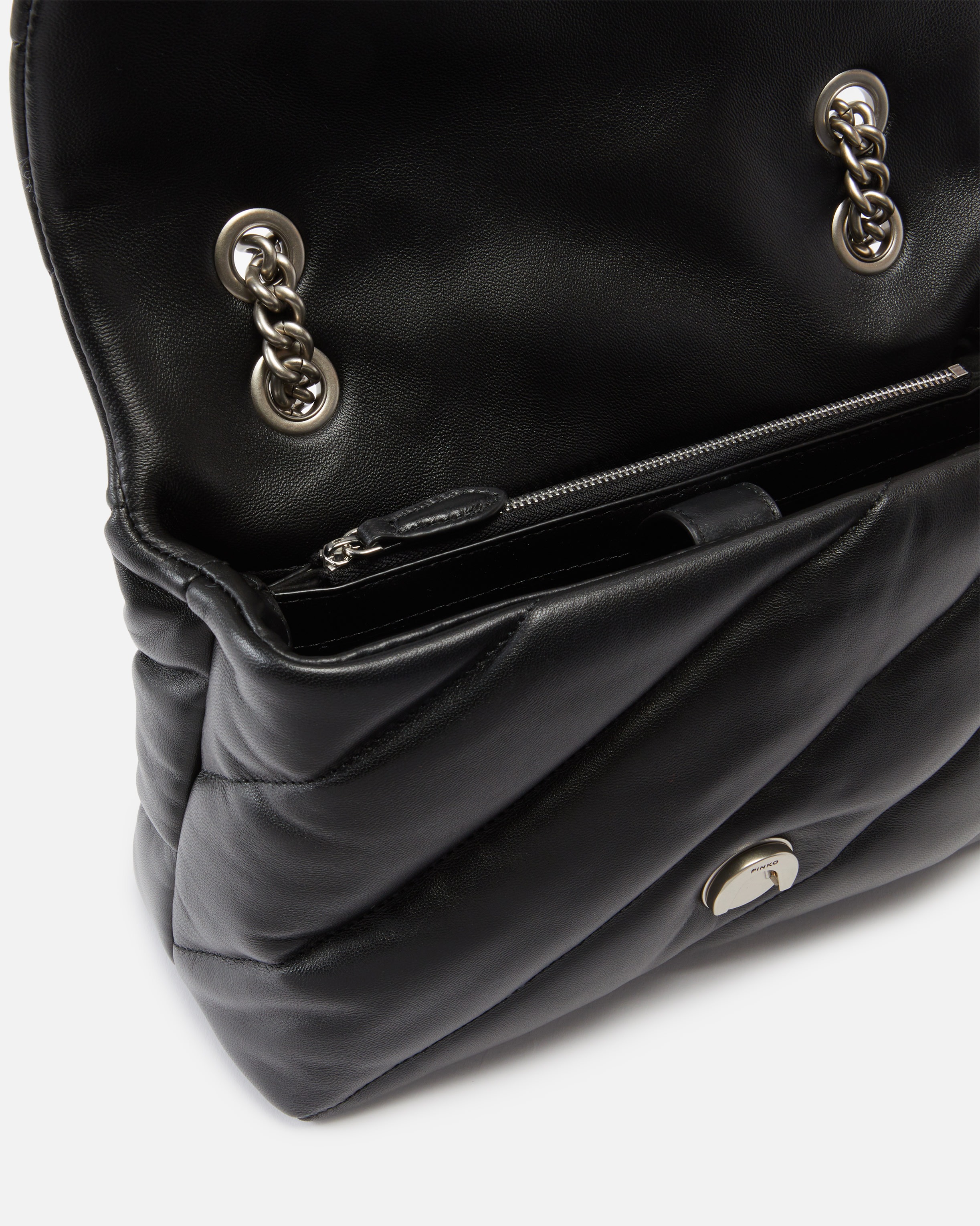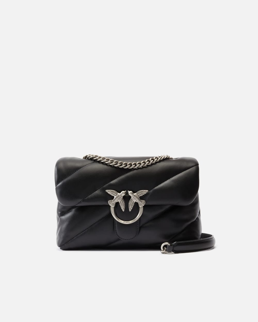 Classica borsa a tracolla Love Bag Puff in nappa morbida trapuntata con maxi pattern obliquo. La chiusura con patta è personalizzata con fibbia iconica in metallo Love Birds Diamond Cut. L'interno è foderato in tessuto scamosciato e include tramezza chiusa con zip e tasca a parete. Completa di tracolla che combina la classica catena metallica rotonda al pratico spallaccio in nappa. Attiva la tua borsa PINKO: verifica l'autenticità del tuo prodotto e accedi all'esperienza personalizzata avvicinando il tuo smartphone al ricamo Love Birds che trovi sul retro della borsa!