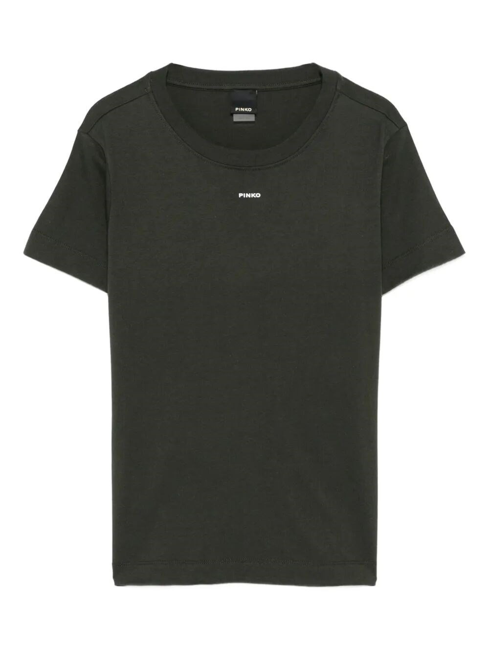 T-shirt a manica corta da donna realizzata in jersey di cotone trattamento old wash personalizzata con stampa mini logo PINKO centrale davanti.