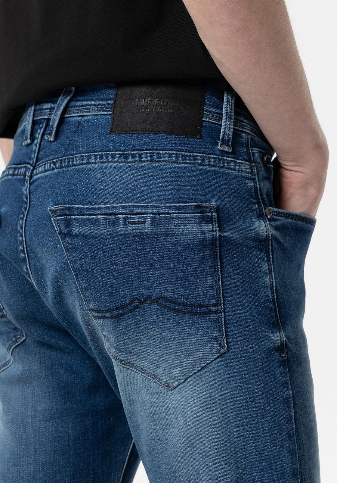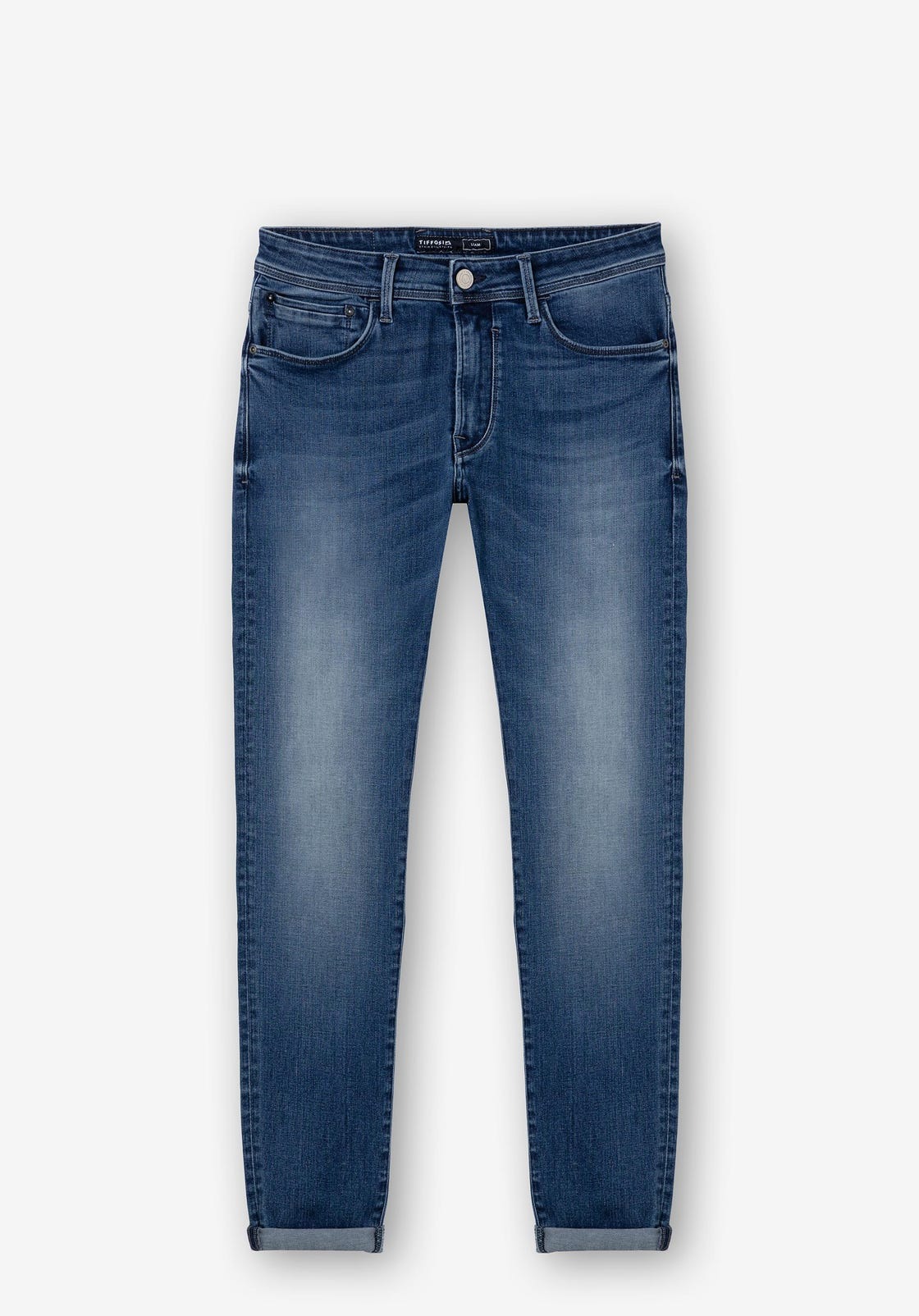 Jeans slim fit con cinque tasche. Chiusura frontale con zip e bottone in metallo.