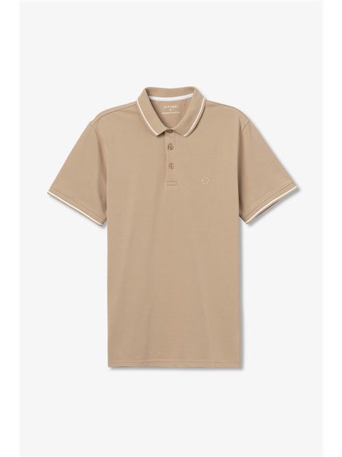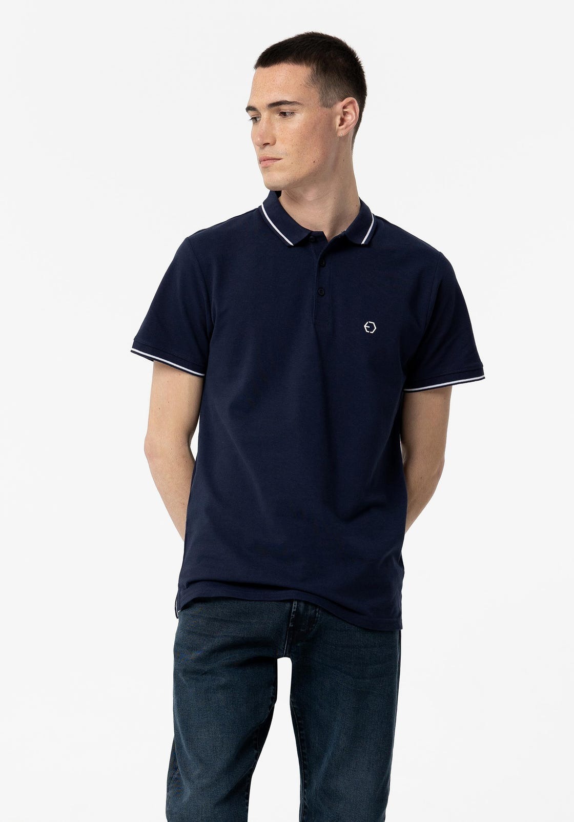 Polo con collo a revers e maniche corte. Chiusura frontale con bottoni. Dettaglio stampa frontale con rilievo e righe sul colletto e sulle maniche. Fondo con aperture laterali.