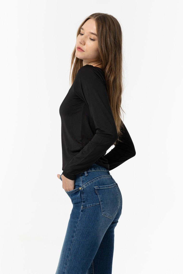 Jeans a vita media con cinque tasche. Effetto push-up. Chiusura frontale con zip e bottoni in metallo.