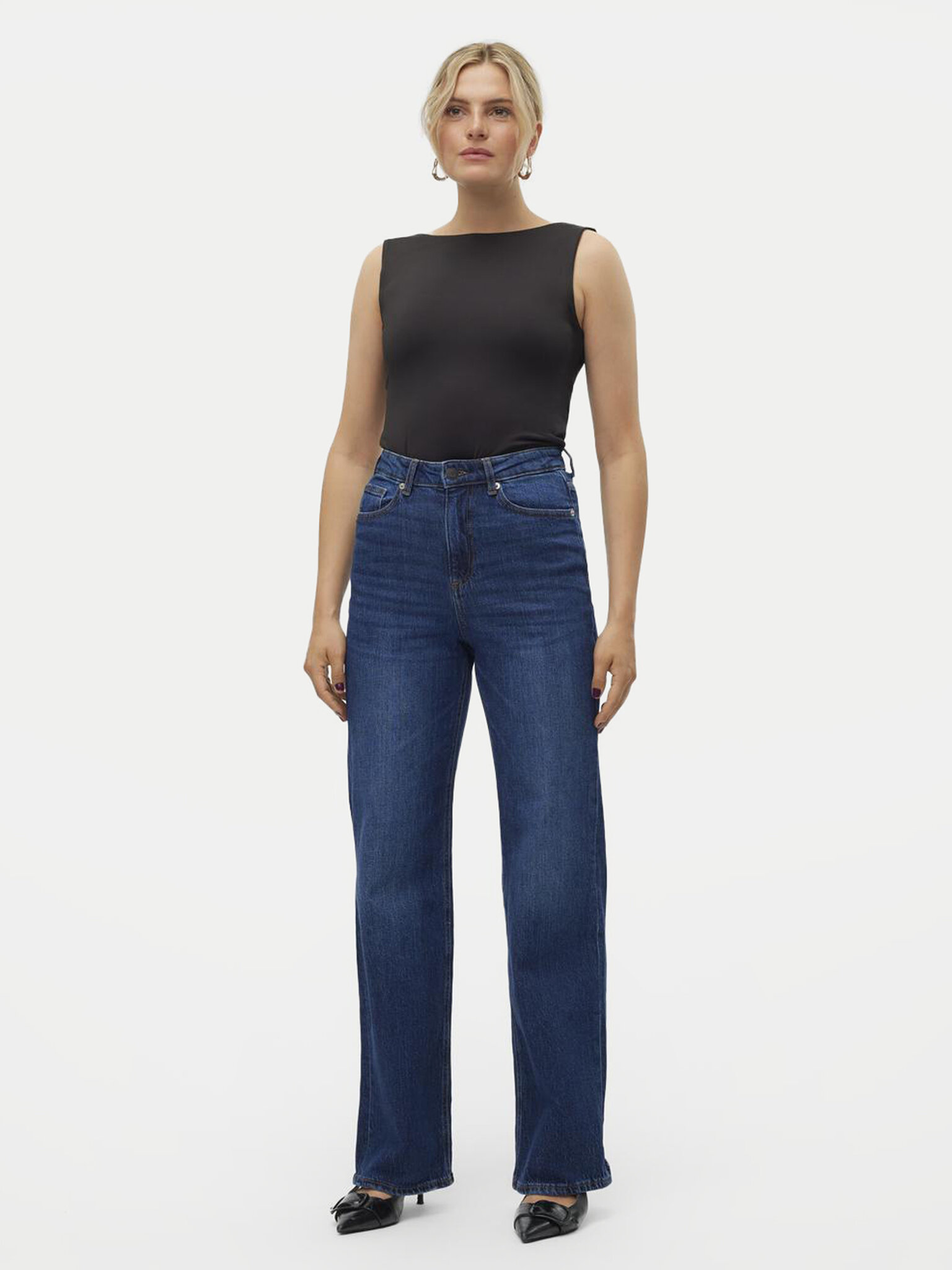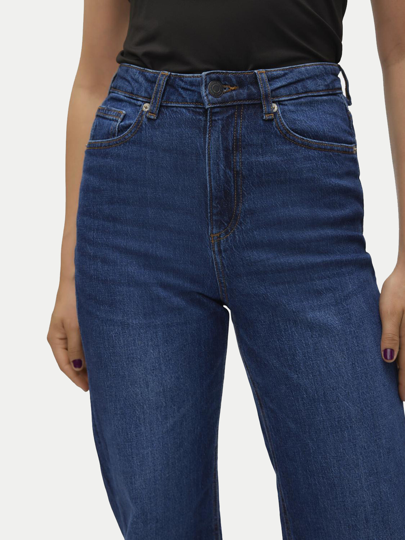 Jeans modello cinque tasche Vestibilità a gamba larga Design a vita alta Chiusura con zip e bottone Passanti per cintura in vita