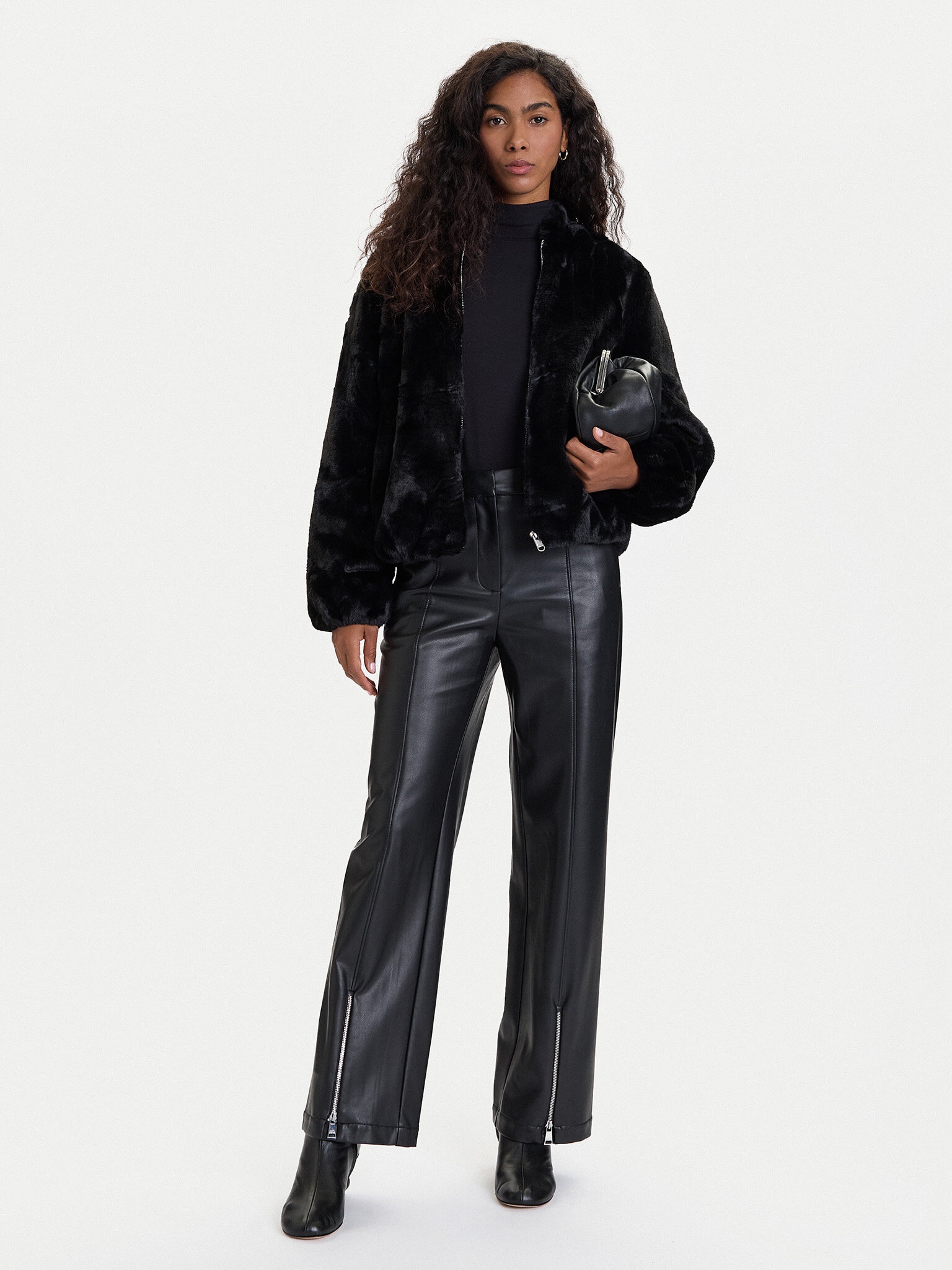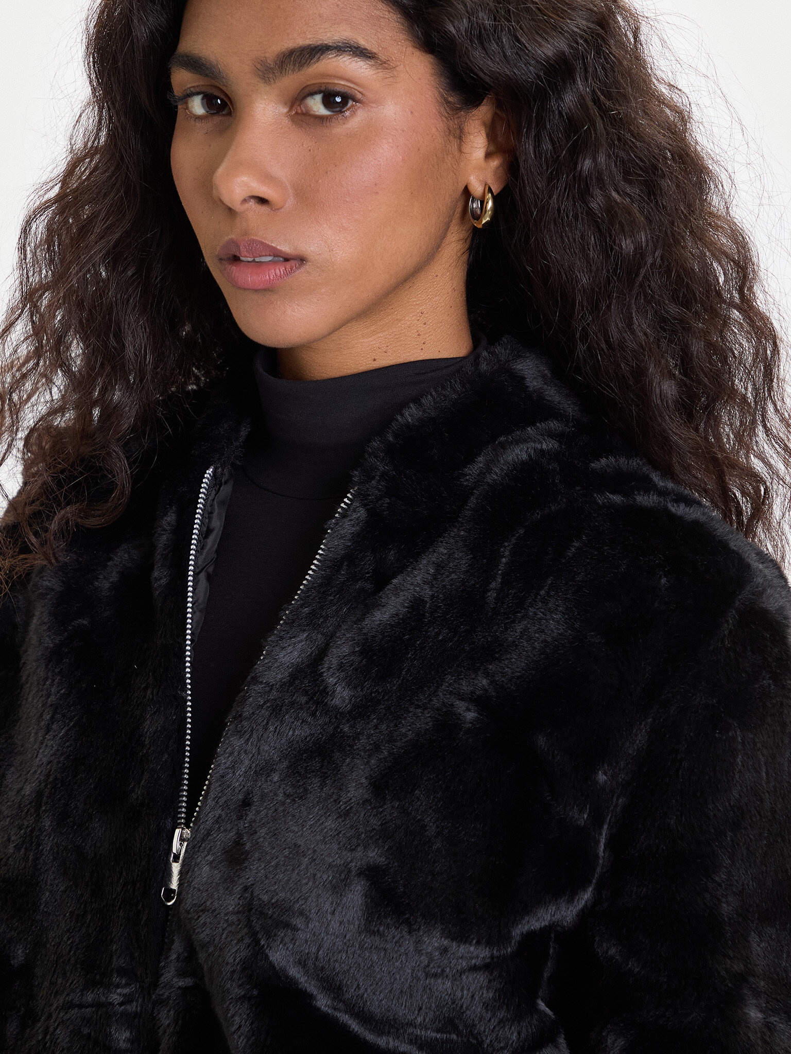 * Giacca corta in materiale peloso.* Chiusura frontale con zip.* Tasche laterali a scomparsa.* Collo rialzato.* Maniche ampie e lunghe.