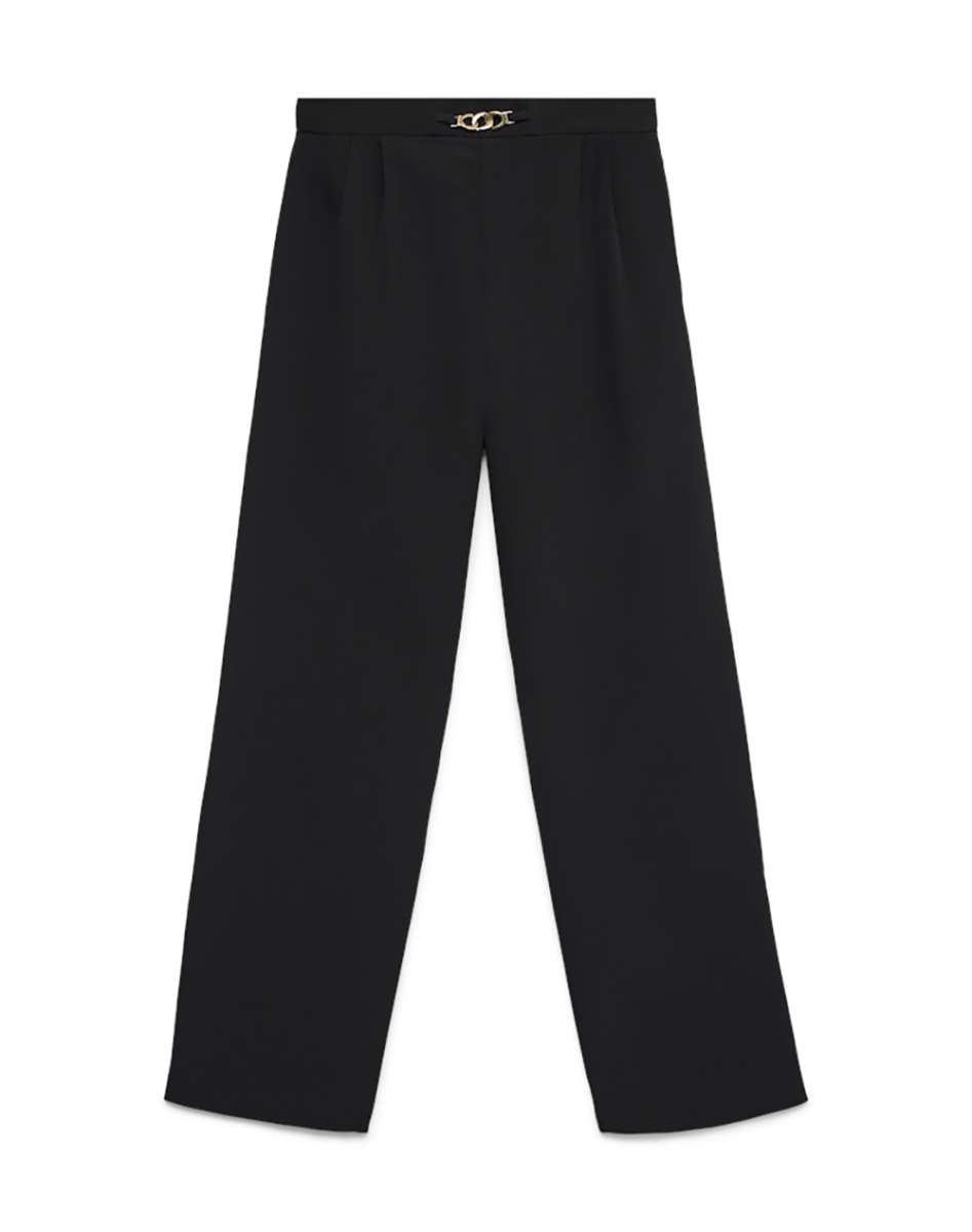 * Pantaloni lunghi con dettaglio metallico sulla cintura.