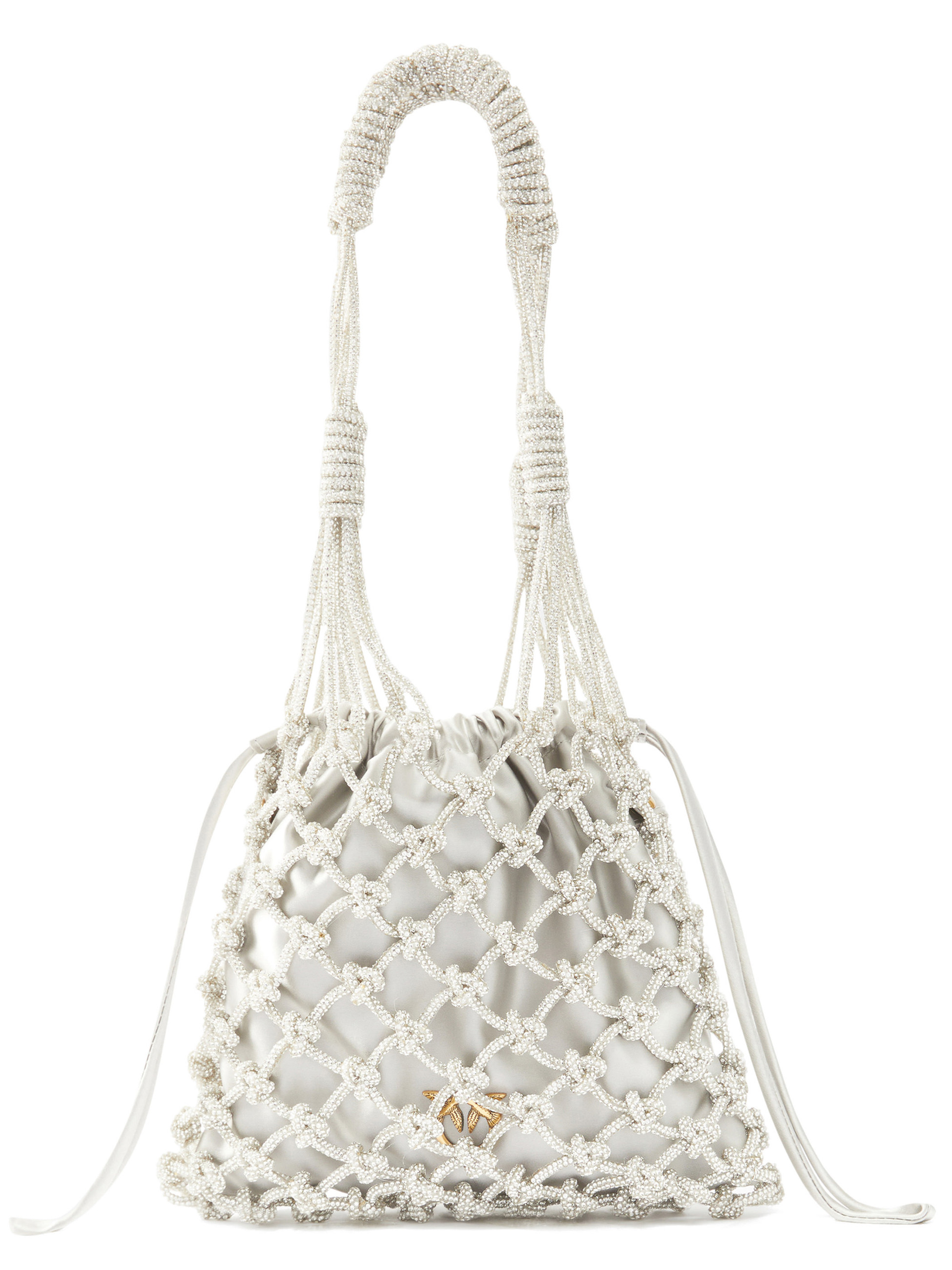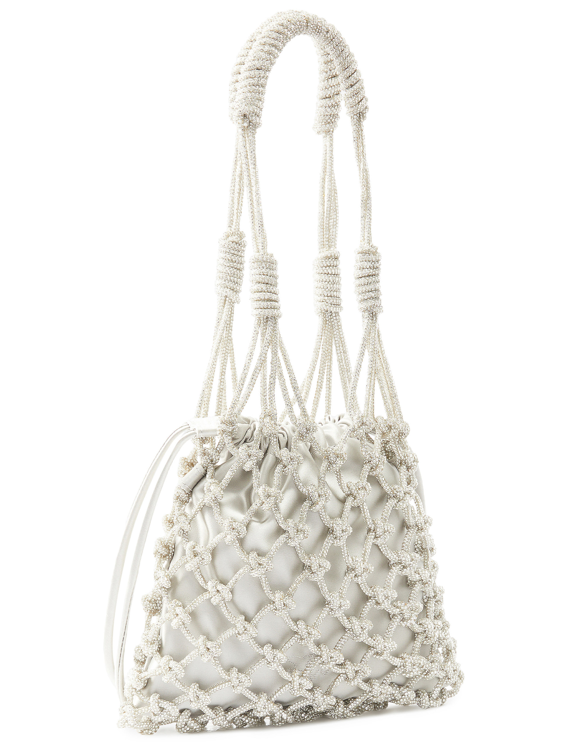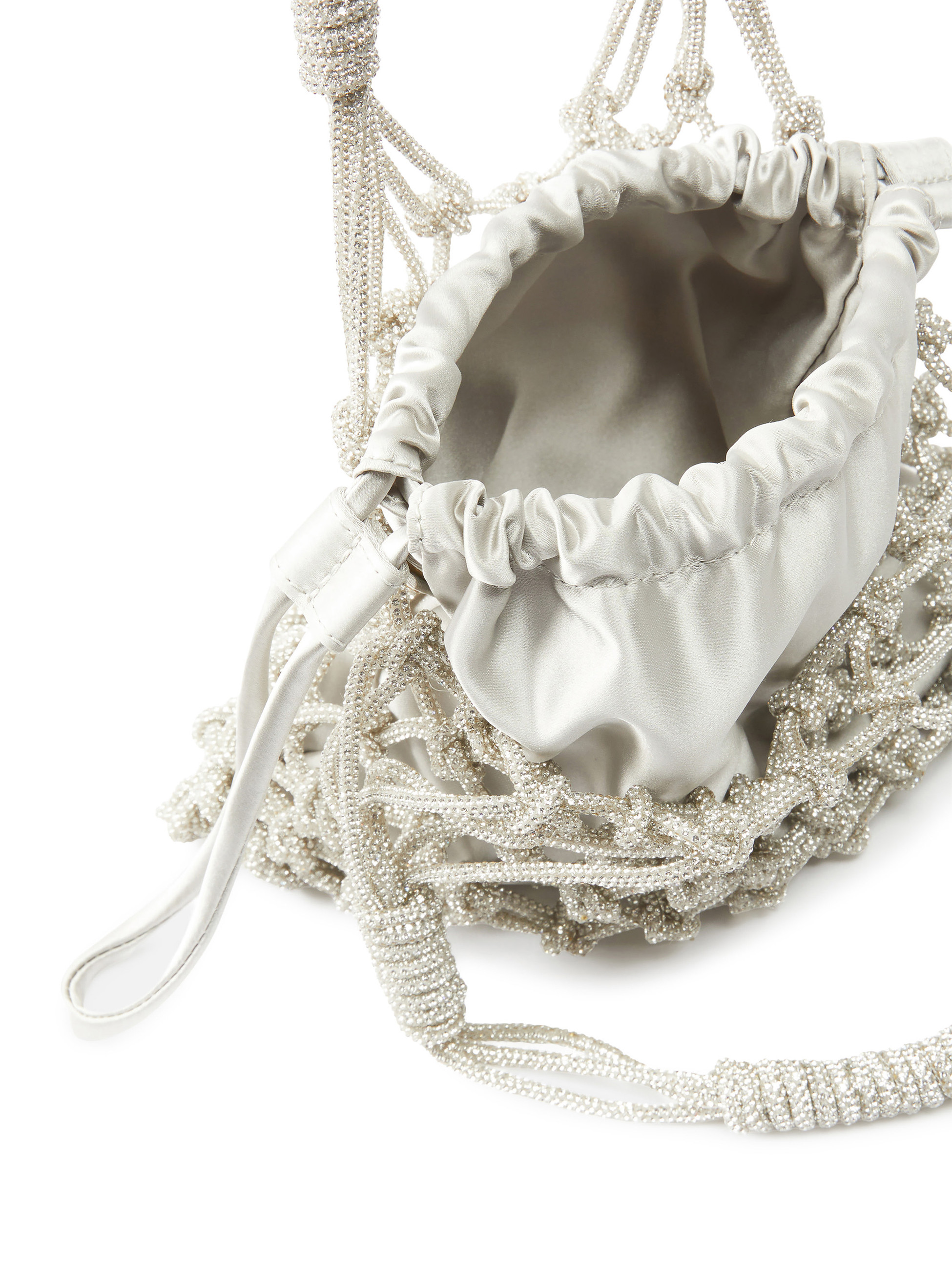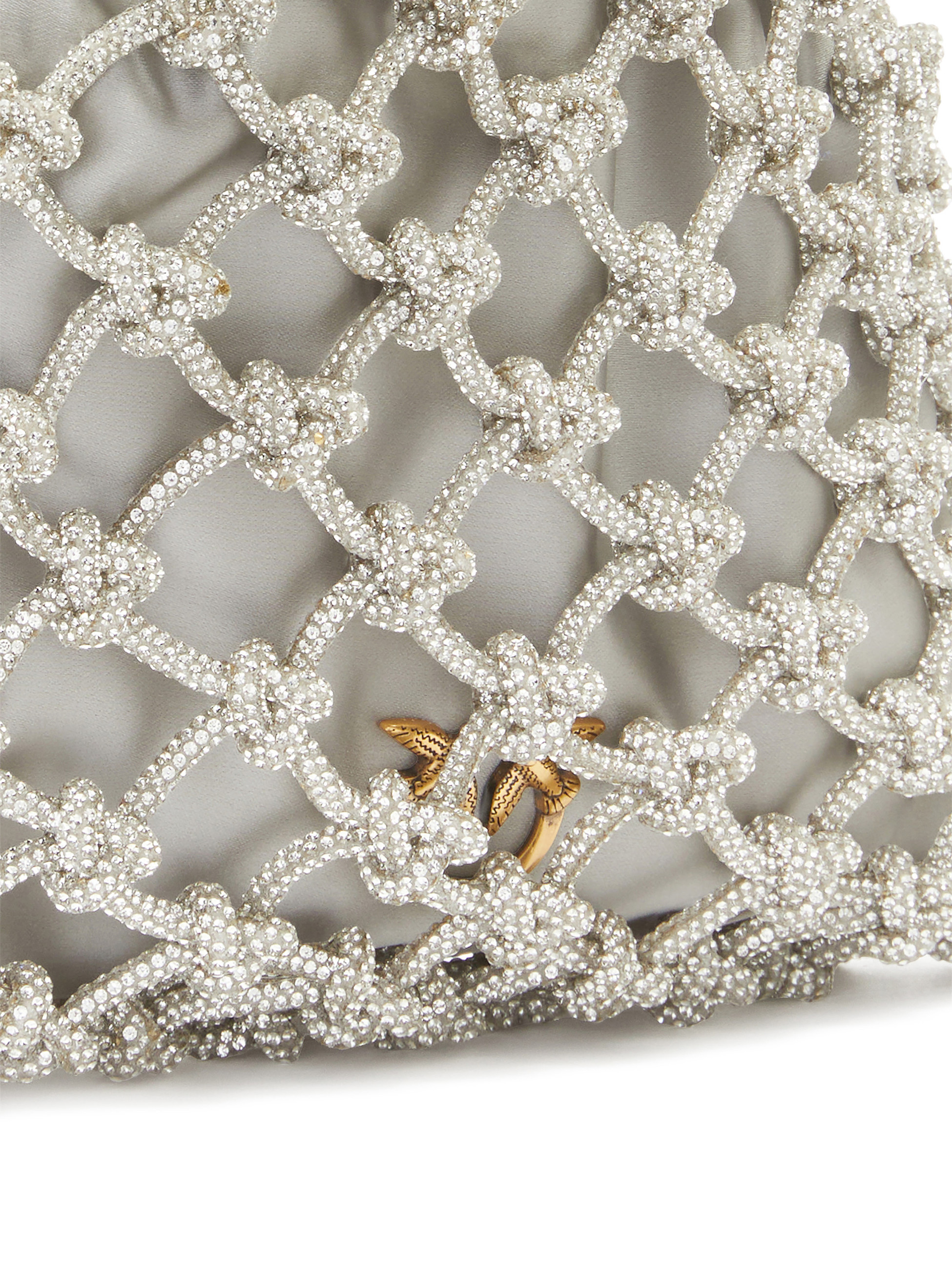 Mini borsa a mano realizzata in tessuto effetto cristallo, dal finish brillante e luminoso. Dotata di doppio manico rigido e tracolla removibile, è perfetta per aggiungere un tocco glam a look da sera o occasioni speciali.
