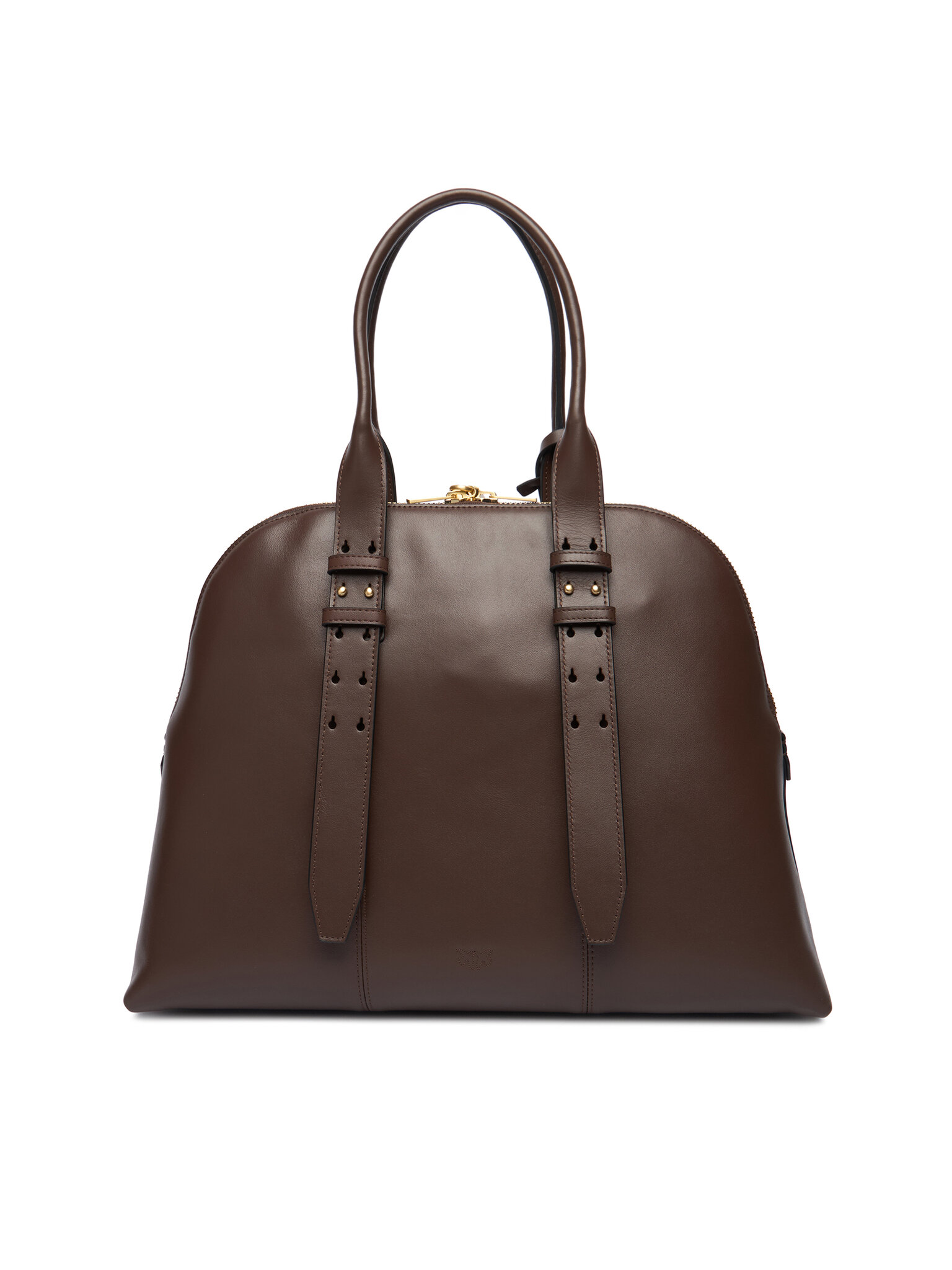 Borsa bowling a mano Escape Bag maxi in morbida pelle, dotata di fodera in cotone e tasca a parete completa di portacarte. Caratterizzata da un doppio manico per la portata a mano o a spalla, la borsa risulta estremamente versatile e pratica. La chiusura superiore con zip a doppio cursore è personalizzata con un dettaglio inedito: un lucchetto decorato dall'iconico logo Love Birds che può essere aperto e chiuso grazie alla chiave contenuta nel charm in pelle che completa la borsa.