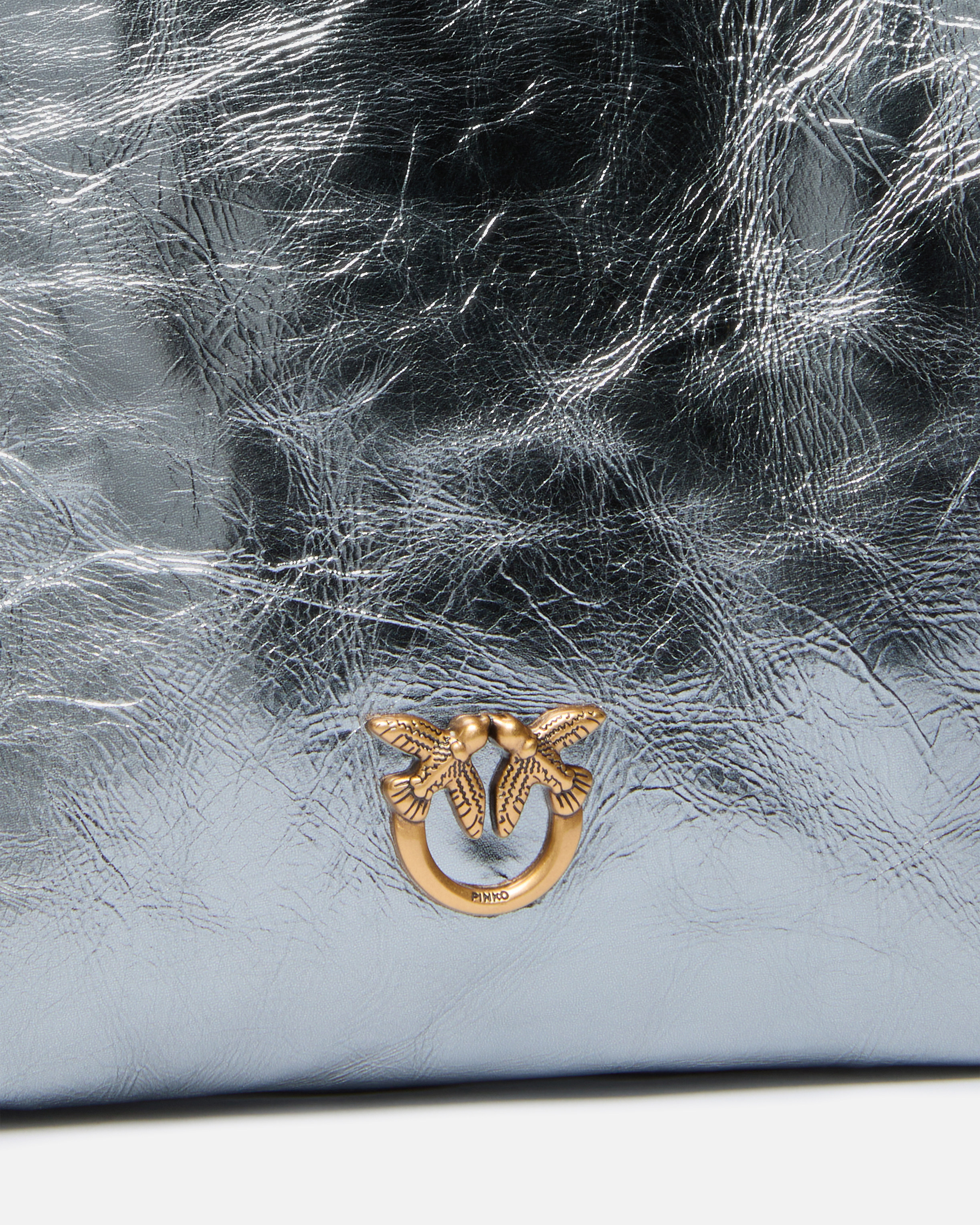 Borsa a mano dalla forma a secchiello piatto realizzata in pelle metallizzata effetto used, dotata di fodera in cotone e sottile tracolla a catena. Il design viene completato dal logo Love Birds, in galvanica resistente color antique gold, che si fa portavoce dell'inimitabile stile del brand. Essenziale e raffinato, questo accessorio è il pezzo mancante dei tuoi look da giorno e non solo.