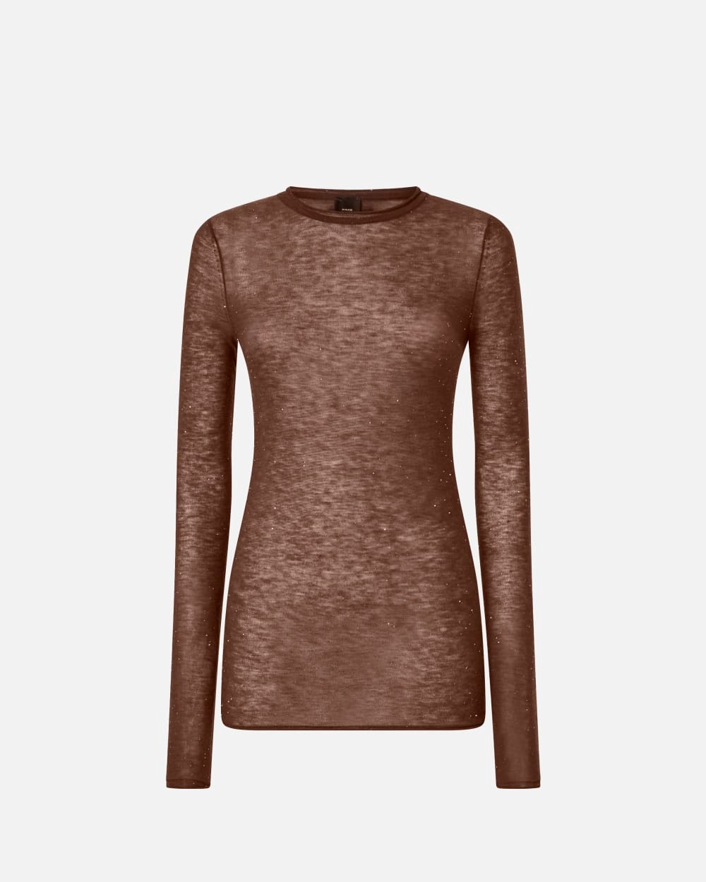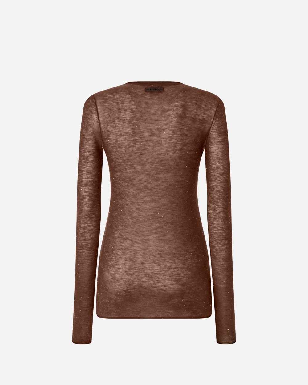 Maglia girocollo realizzata in misto lana semitrasparente: un filato leggero e morbido, quasi impalpabile, che contribuisce a creare un look sensuale e appariscente. Il design è impreziosito da micro paillettes inserite nel filo e riesce nell'impresa di risultare luminoso e al tempo stesso essenziale e molto comodo all'indosso. Il capo è stato sottoposto a prove di finissaggio per ridurre al minimo la possibile formazione di pilling, garantendo una maggiore morbidezza e durabilità del tessuto. Il tocco finale è dato dall'etichetta con logo lettering PINKO sul retro.