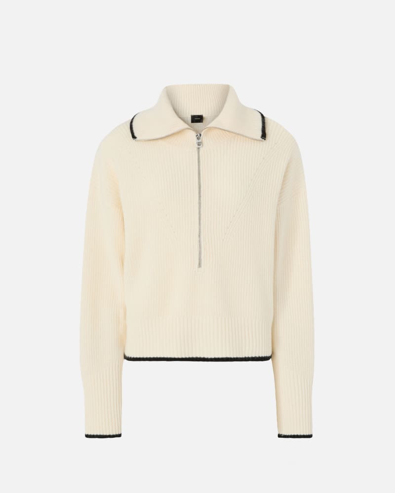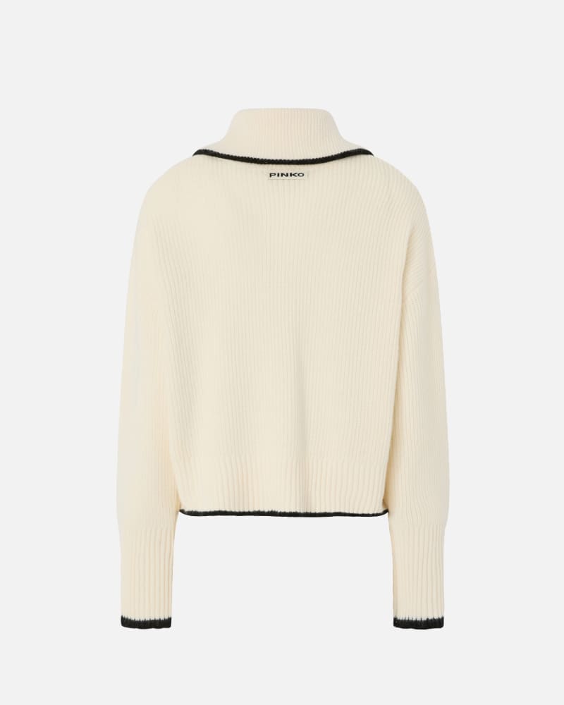 Maglia con zip a mezza altezza in soffice misto lana merino e cashmere: comodità e glamour in un unico capo. Il filato a contrasto su scollo, orlo e polsini dona un tocco di vivacità. Il capo è stato sottoposto a prove di finissaggio per ridurre al minimo la possibile formazione di pilling, garantendo una maggiore morbidezza e durabilità del tessuto. Il tocco finale è dato dall'etichetta tono su tono con logo lettering PINKO dietro al collo.