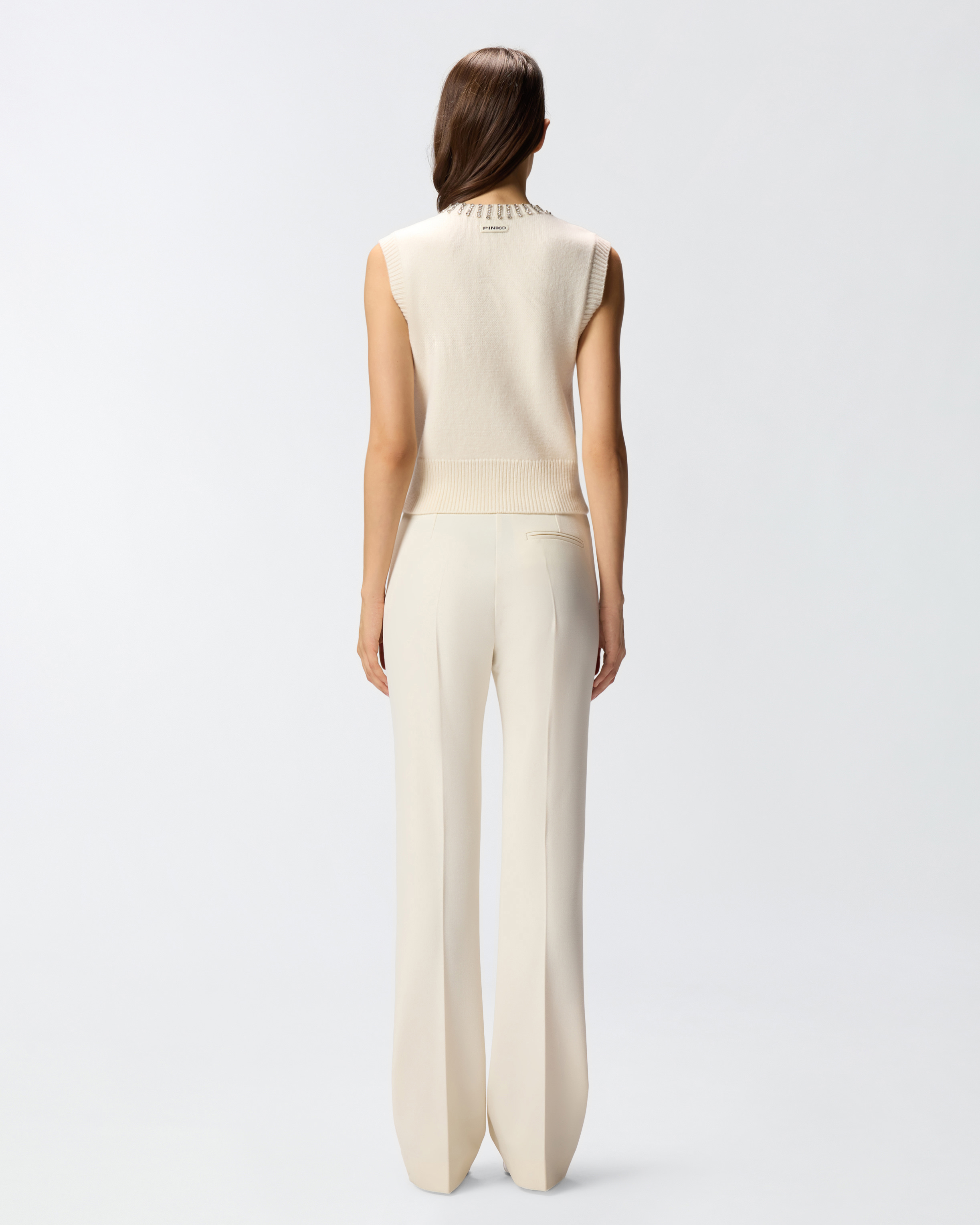 Gilet in maglia di misto lana con scollo a V, perfetto per le giornate in ufficio e non solo. L'orlo e il giromanica sono lavorati a coste, mentre il capo è completato dall'etichetta tono su tono con logo lettering PINKO sul retro. Il capo è stato sottoposto a prove di finissaggio per ridurre al minimo la possibile formazione di pilling, garantendo una maggiore morbidezza e durabilità del tessuto. Il design è immediatamente riconoscibile grazie agli strass di diverso tipo: ricamati con rigore sullo scollo, mentre sul resto del modello sono caratterizzati da diverse dimensioni e forme geometriche per un tocco inaspettato.