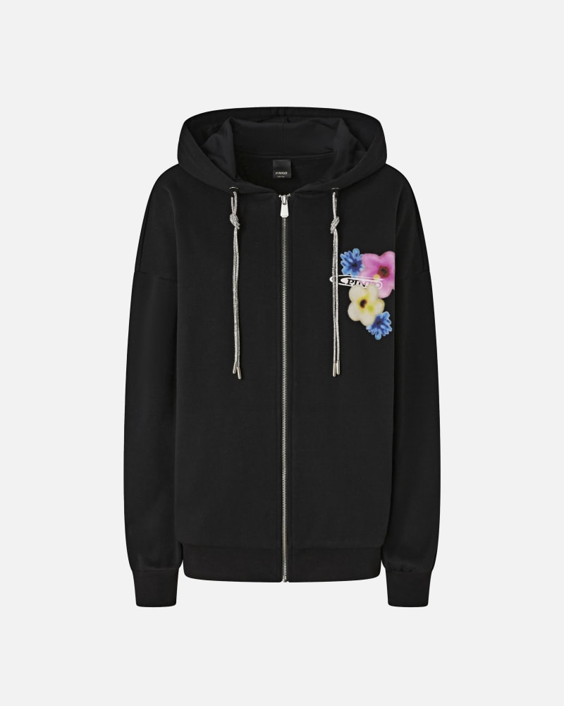 Felpa a maniche lunghe in cotone garzato completa di cappuccio e di chiusura frontale con zip a vista. Il modello è personalizzato con una stampa floreale multicolore, realizzata con tecnica digitale, presente in versione maxi sul retro e in versione mini lato cuore, sempre accompagnata dal logo lettering PINKO. Il cappuccio è regolabile tramite una scintillante coulisse rivestita di strass, perfetta per donare al capo un tocco femminile. La felpa è ideale per le giornate casual di inizio stagione, da indossare tutto il giorno per uno stile originale.
