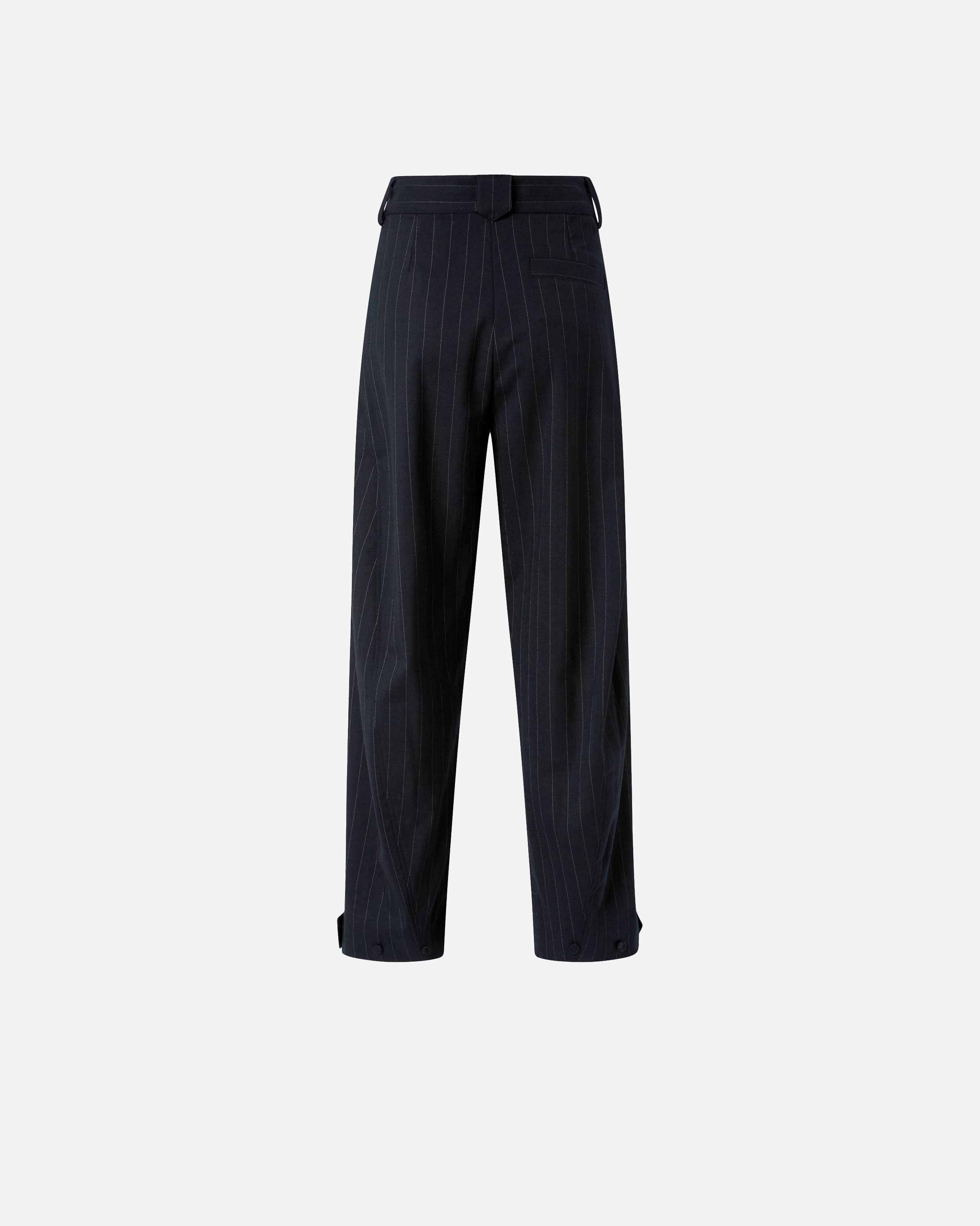 Pantaloni balloon-fit con gamba a palloncino morbida e arrotondata nella parte superiore e più stretta al fondo, dove si trova anche un cinturino per regolare l'indosso a seconda delle necessità. Il tessuto utilizzato è un classico gessato in lana poly caratterizzato da un cambio di tessitura e di luce a sottolineare il disegno del materiale. Il design sartoriale del capo è ulteriormente evidenziato dalle pinces, dalla costruzione della vita con passanti per cintura e dal taschino a filetto sul retro. Chiusura con bottone e zip nascosta. Abbina i pantaloni con il blazer nello stesso tessuto per un effetto tailleur, oppure indossa una camicia per un look formale, ma non troppo.