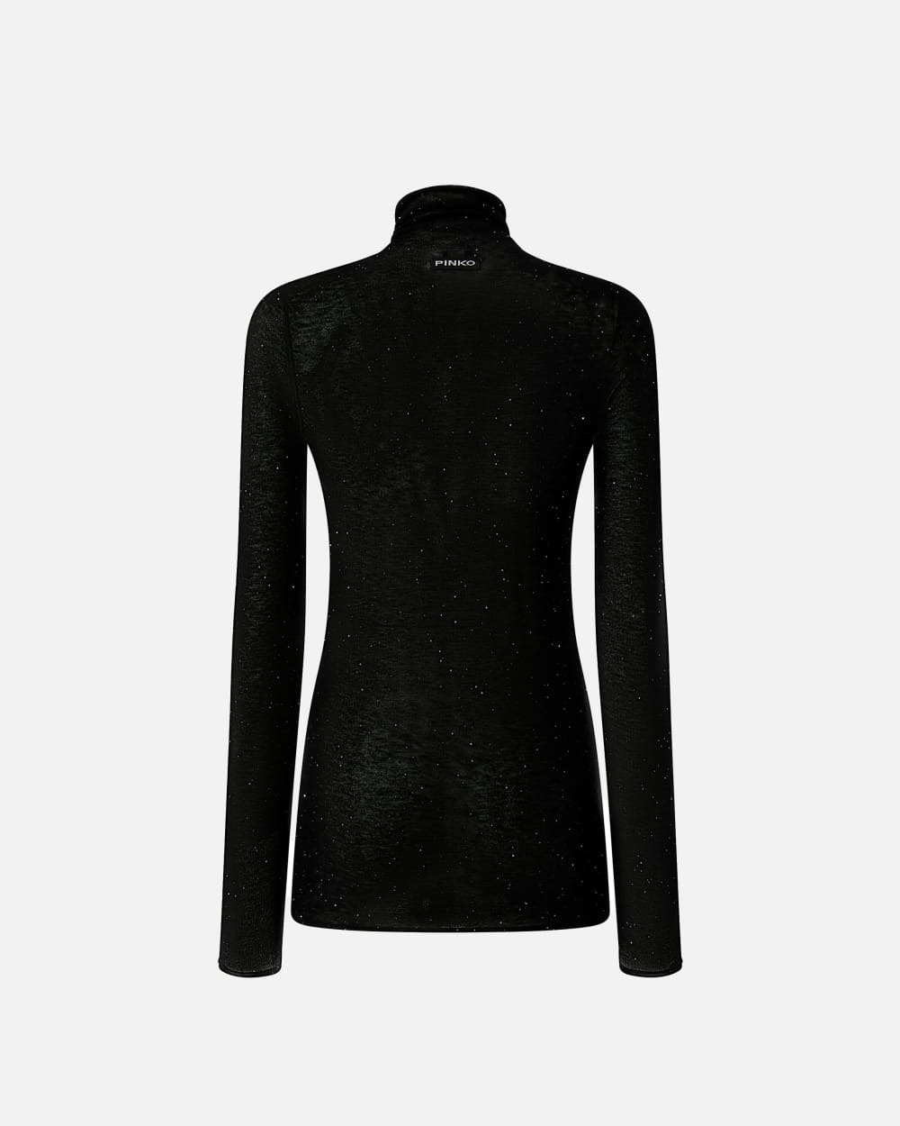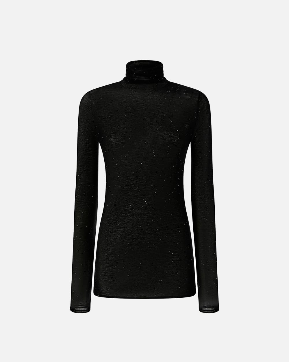 Maglia a maniche lunghe realizzata in misto lana semitrasparente: un filato leggero e morbido, quasi impalpabile, che contribuisce a creare un look sensuale e originale. Il design è impreziosito da micro paillettes inserite nel filo e riesce nell'impresa di risultare luminoso e al tempo stesso essenziale e molto comodo all'indosso. La linea aderente della maglia a collo alto è completata dall'etichetta logata nel centro dietro. Il capo è stato sottoposto a prove di finissaggio per ridurre al minimo la possibile formazione di pilling, garantendo una maggiore morbidezza e durabilità del tessuto.