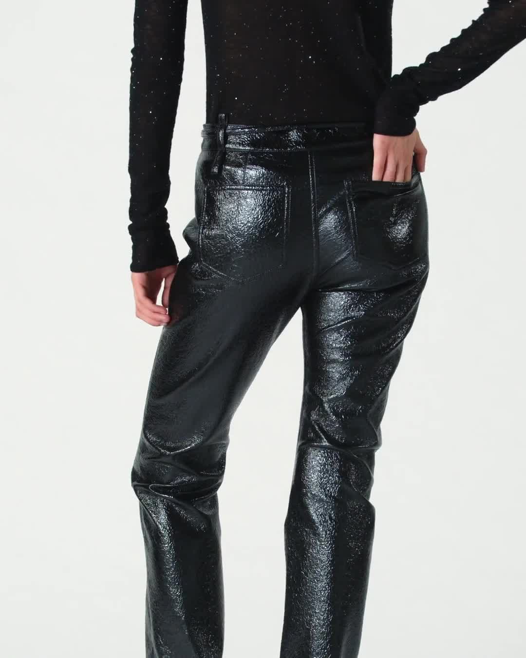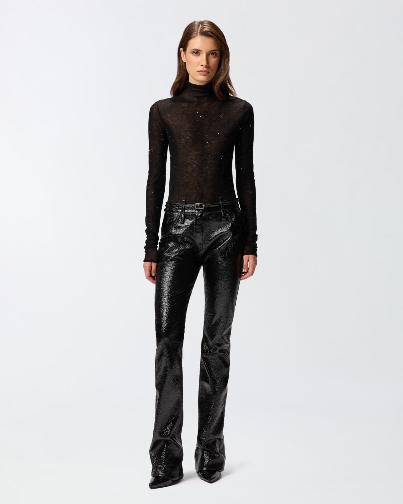 Pantaloni lunghi a gamba dritta, realizzati in jersey confortevole dalla mano calda con spalmatura effetto vernice. I dettagli più interessanti del modello, dotato di una pratica chiusura frontale con bottone e zip, sono i passanti ad anello che escono dalla vita per ospitare una cinturina rimovibile da appoggiare direttamente sulla pelle. Esprimi la tua femminilità con uno stile audace e originale, indossando questo capo per un look serale dal sapore biker.
