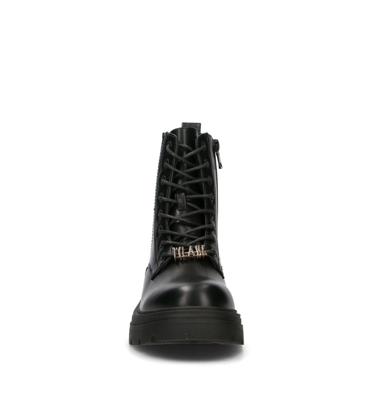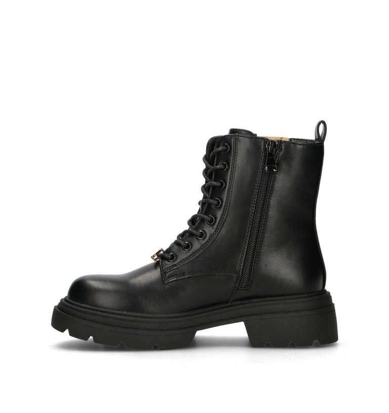 Anfibio donna nero in materiale sintetico. Linea decisa e dettagli iconici per un modello con inserti laterali impreziositi dalla stampa Geo Classic. La suola spessa e la chiusura con lacci e zip interna assicurano praticità e stile urbano. Un design che unisce carattere e raffinatezza per look contemporanei e distintivi.