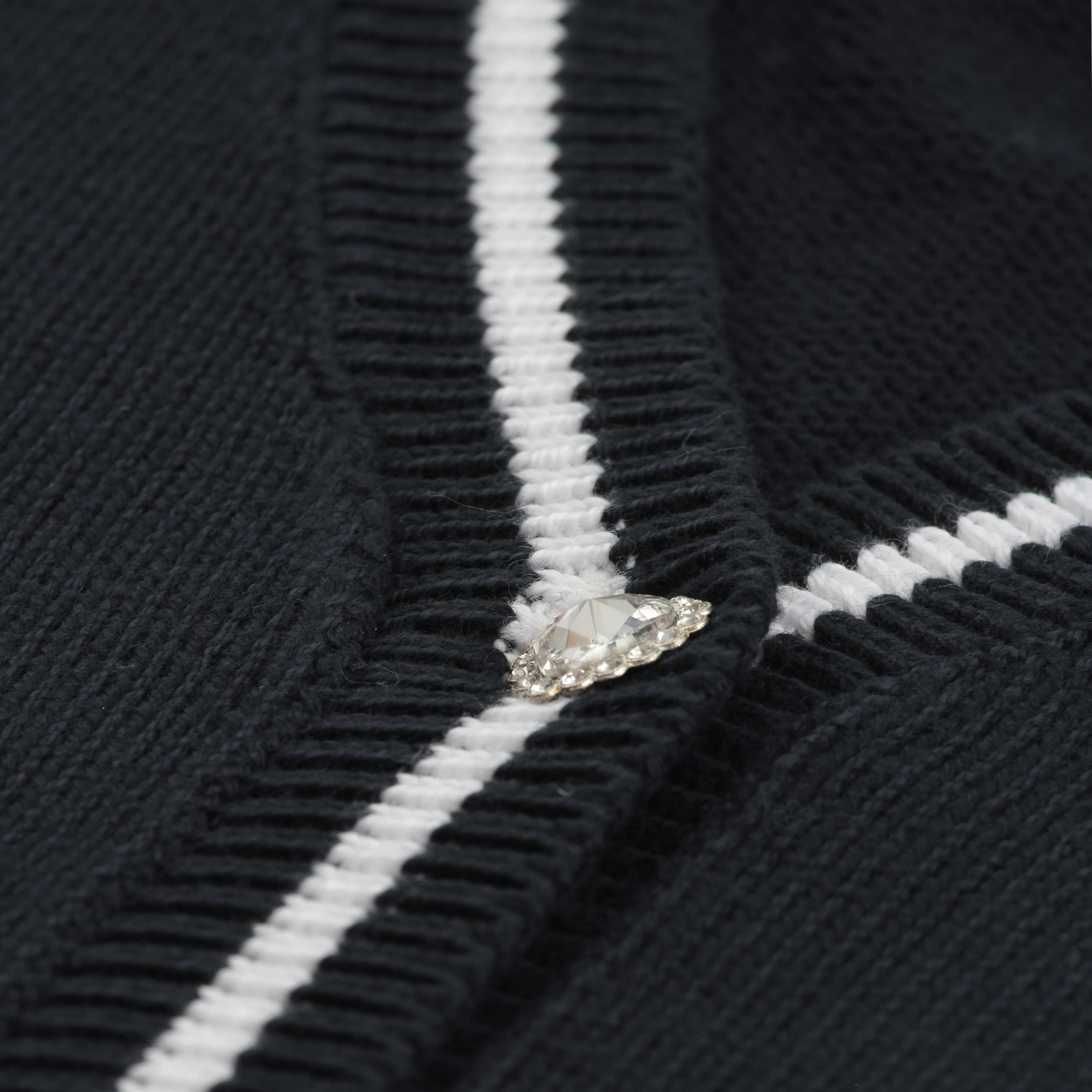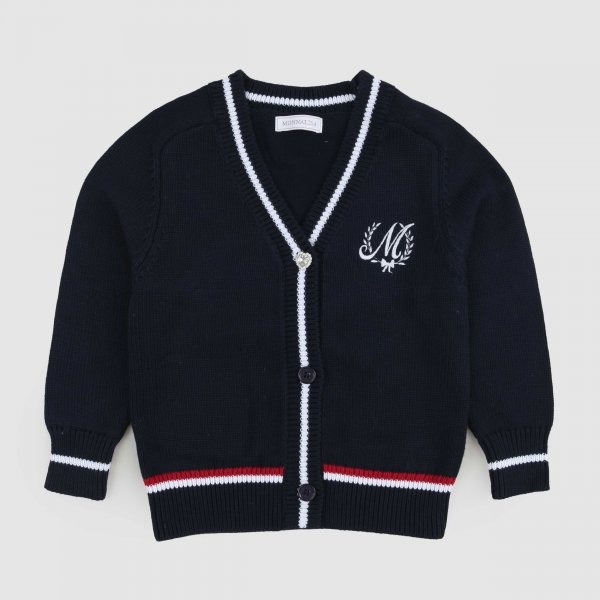 Cardigan blu con logo firmato MONNALISA, un capo d'abbigliamento per chi ama la moda fatta bene, da vivere ogni giorno. Si chiude delicatamente sul davanti grazie a piccoli bottoni gioiello tono su tono che brillano appena sotto la luce. I bordi, collo, polsi e fondo, sono rifiniti in contrasto bianco latte, disegnando linee nette e marine che illuminano la maglia. Sul lato sinistro, il logo è ricamato in rilievo sempre in bianco, piccolo ma deciso, a firmare la qualità del capo. Taglio regolare, morbido e facile da indossare: perfetto sopra una t-shirt a righe o sotto un piumino leggero, per la scuola, le passeggiate e i weekend in famiglia.
