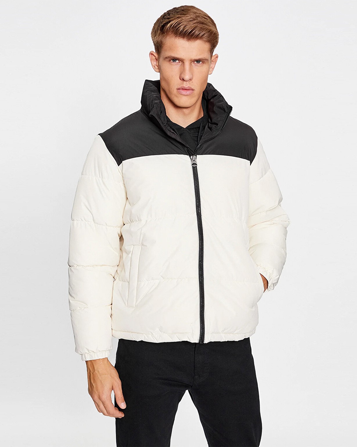 Giubbotto con collo alto per uomo, chiusura tramite zip centrale, maniche lunghe con polsini, inserto inferiore a contrasto colore, tasche laterali