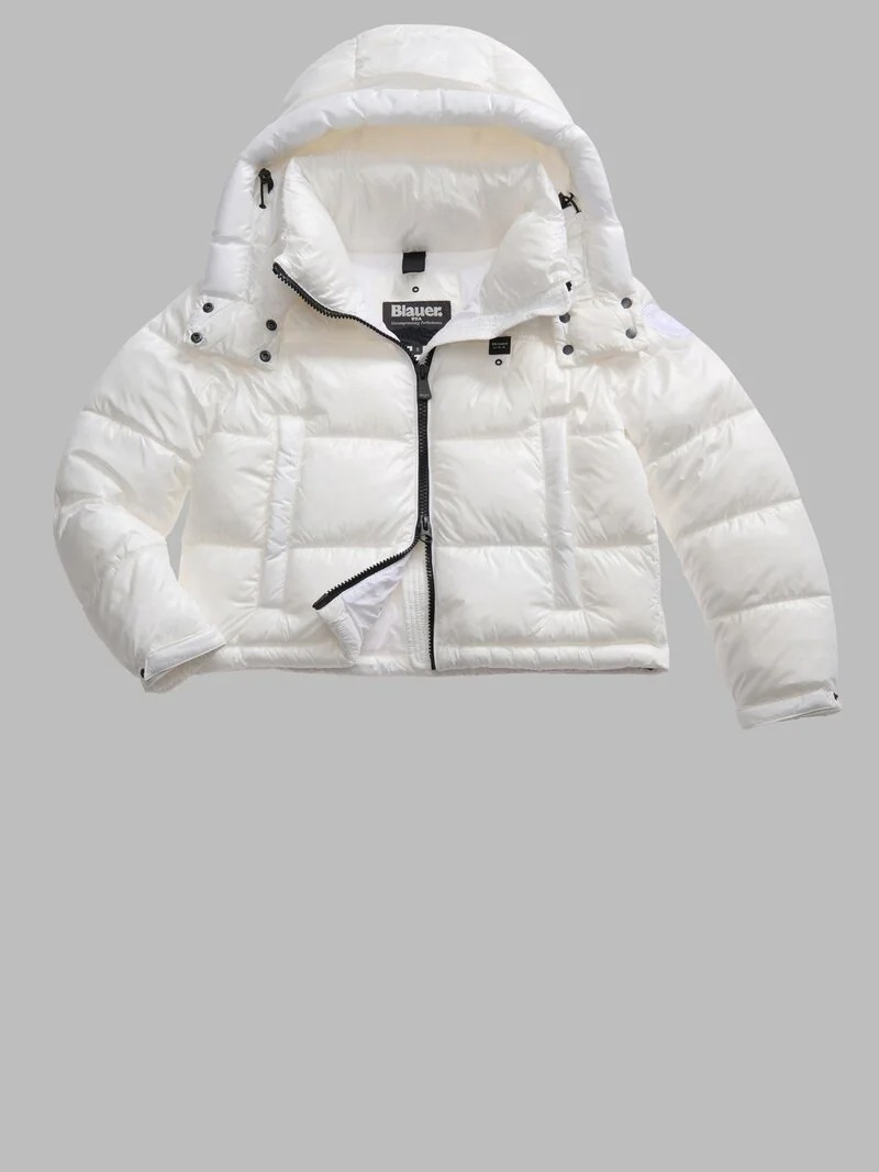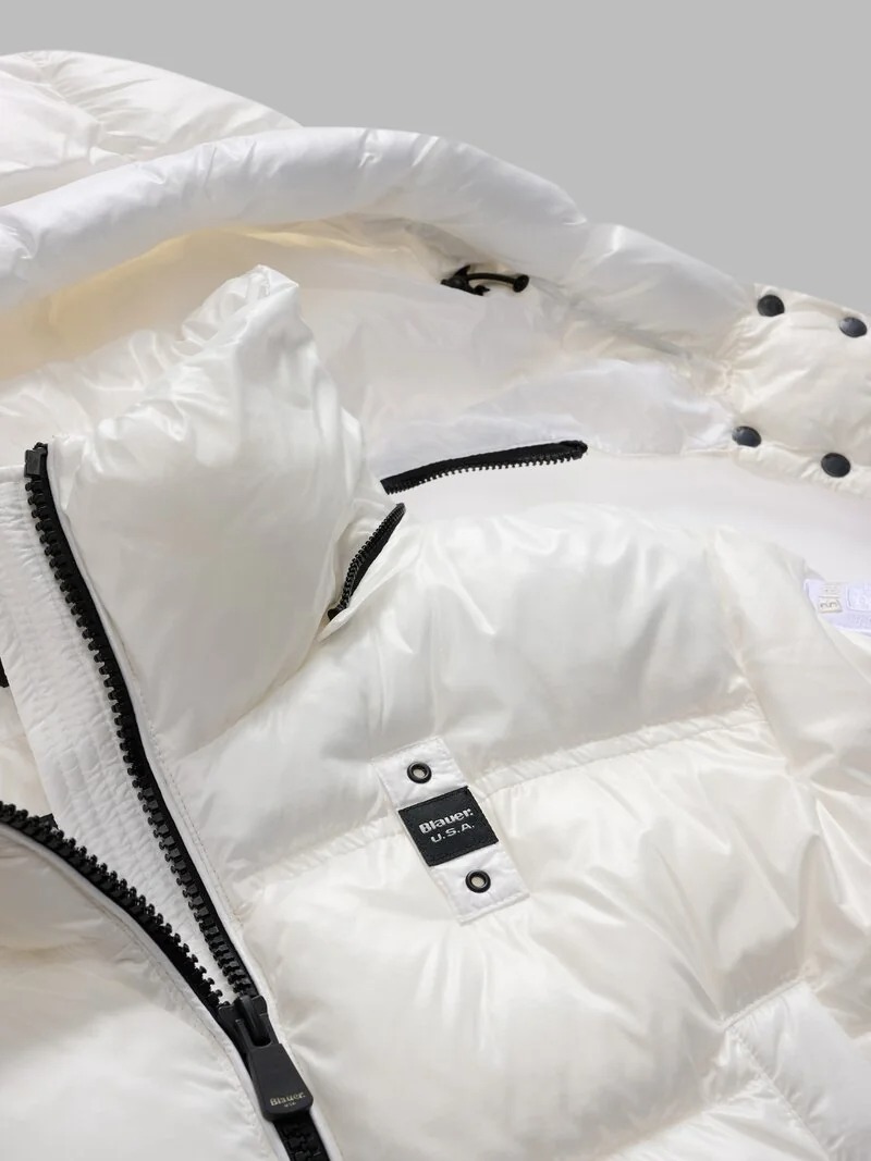 Giubbetto invernale in nylon micro rip idrorepellente con colletto alto removibile. Imbottitura sostenibile con impuntura a righe orizzontali con interno in contrasto colore per abbinare il giubbetto con eleganza e calore.