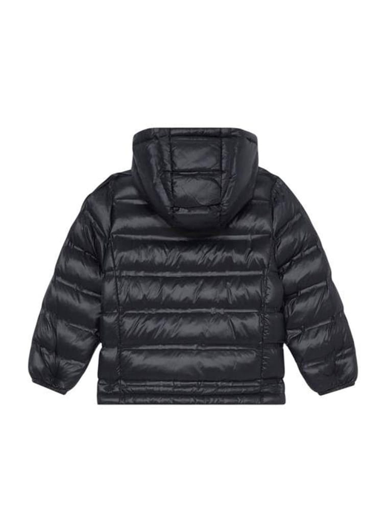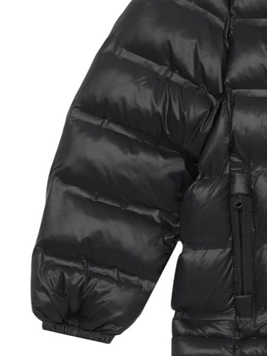 Piumino lucido lungo trapuntato a righe orizzontali con cappuccio fisso, bordo in pelliccia removibile ed interno in contrasto colore. Capo con colori fashion e dal taglio che risalta il punto vita.