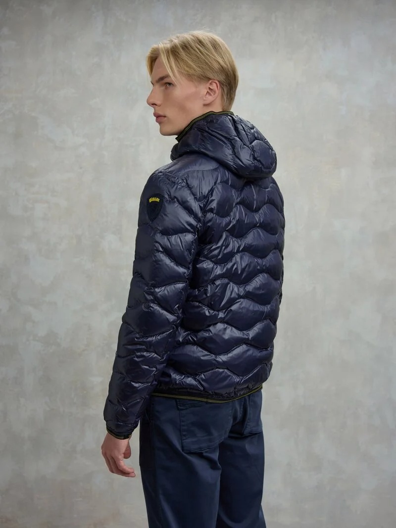 Piumino con trapuntatura a onde orizzontali. Taschino applicato sul petto a sinistra per dare un tocco più funzionale all'iconico capo Blauer. Imbottitura in piuma naturale, calda e leggera; Dedicato a chi vuole essere sempre alla moda in ogni occasione.