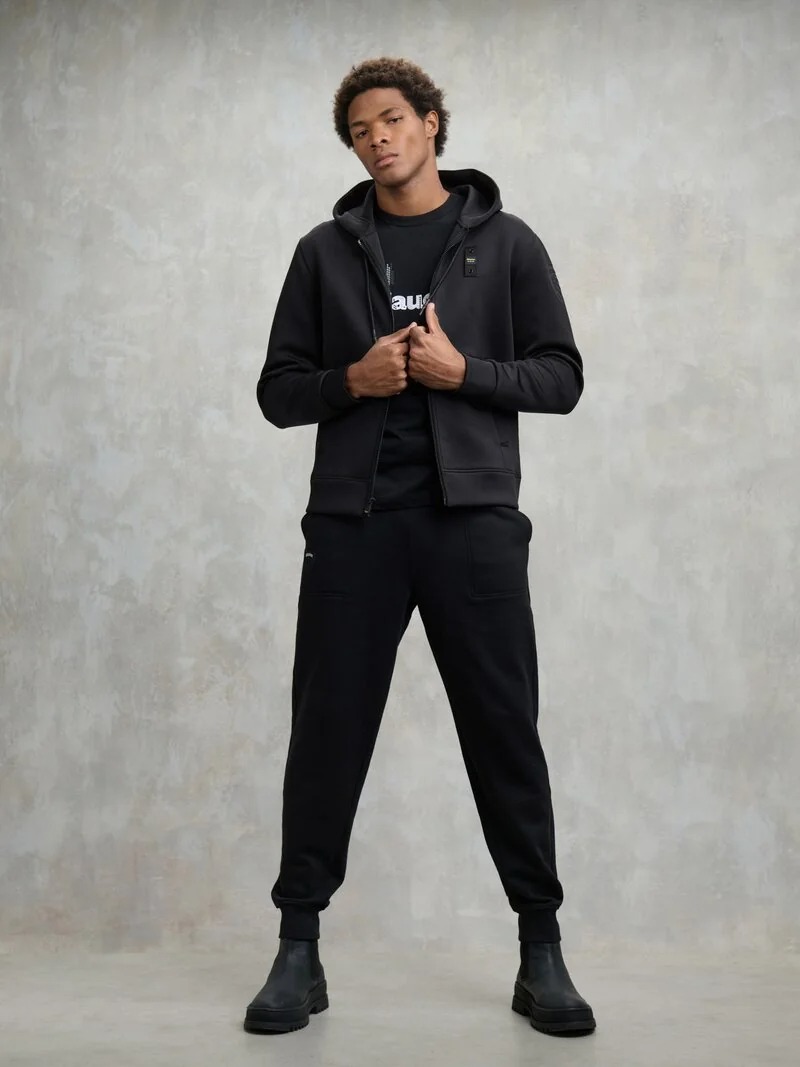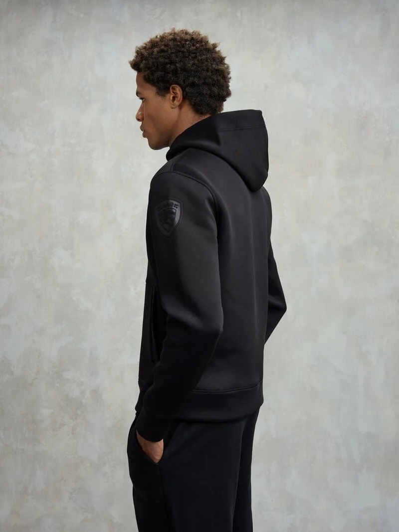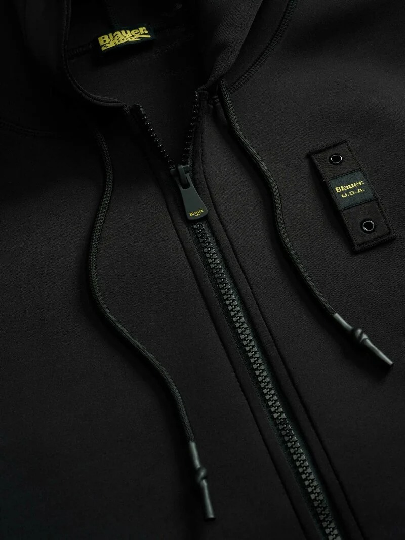 Felpa con cappuccio aperta sul davanti in tessuto scuba leggermente elasticizzato. Tessuto resistente allo schiacciamento e alla stropicciatura.