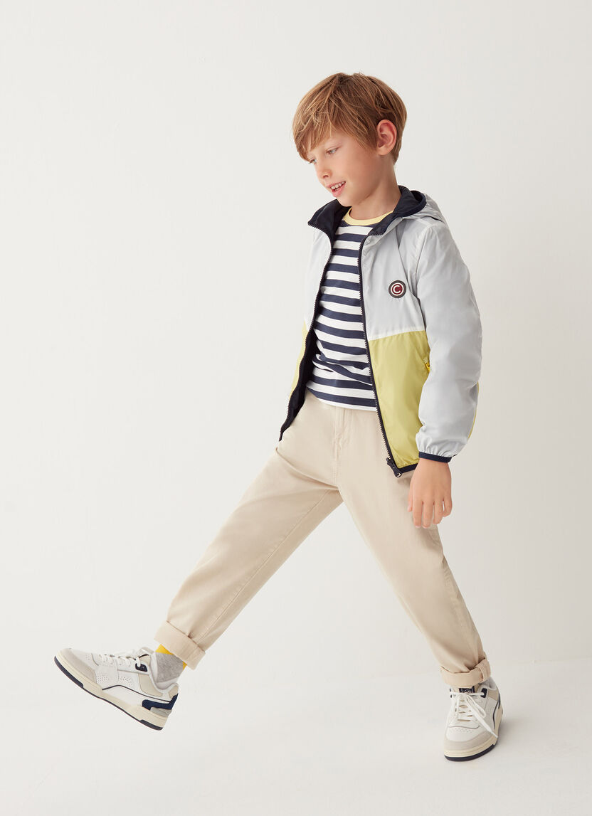 Giacca reversibile da bambino realizzata in tessuto semi lucido riciclato con trattamento idrorepellente. Il color blocking creato dall'utilizzo di colori a contrasto sull'esterno della giacca, rendono il capo sportivo e di forte impatto. L'interno invece è in tinta unita. Un modello versatile e funzionale che ti permette una molteplicità di abbinamenti.