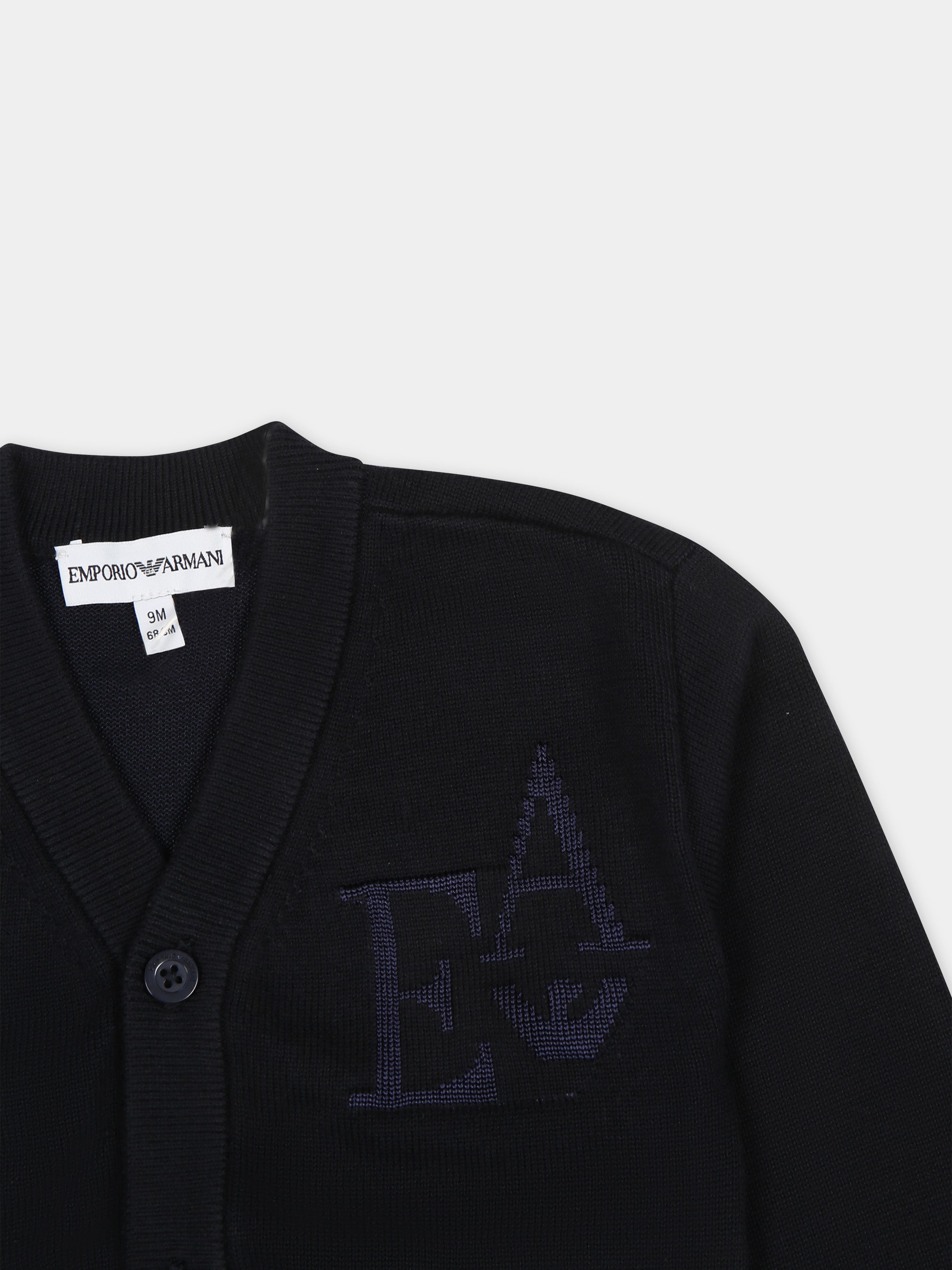 Cardigan blu in cotone, scollo a V, chiusura con bottoni. E' decorato con iconico aquilotto blu e iniziali logo ricamati.