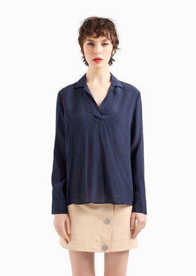 Questa blusa è realizzata in crepe de chine fluida ed è caratterizzata dallo scollo a V con colletto e dalle maniche morbide. Elegante ma non troppo formale, questa blusa è un capo passepartout.