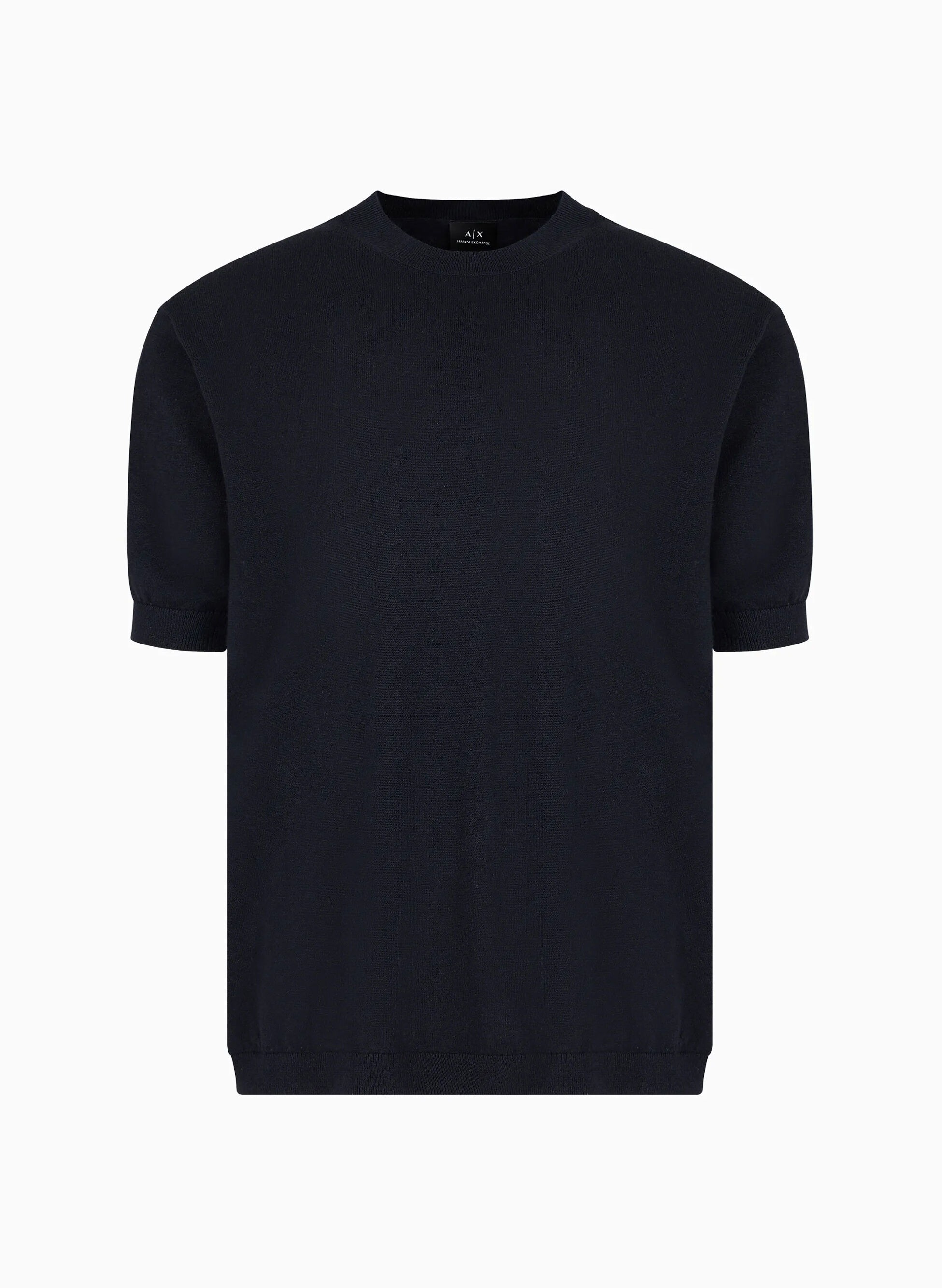 Maglia leggera firmata Armani Exchange in misto lino lavorata a maglia con collo tono e maniche corte. Vestibilità regolare.