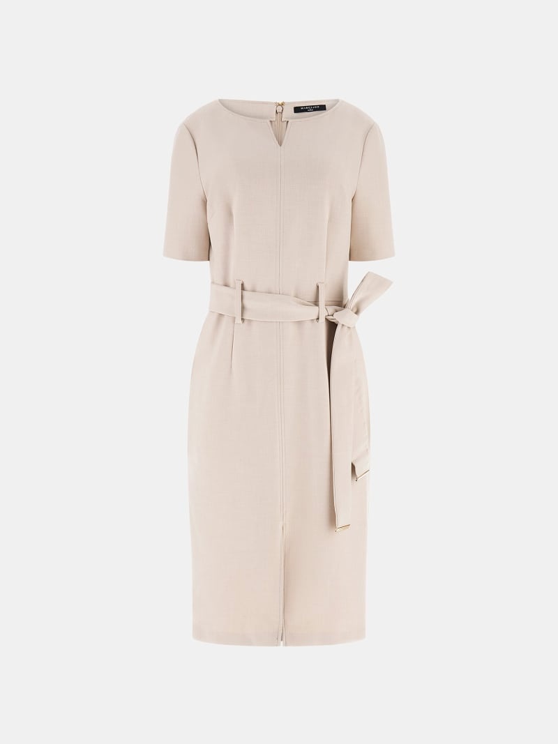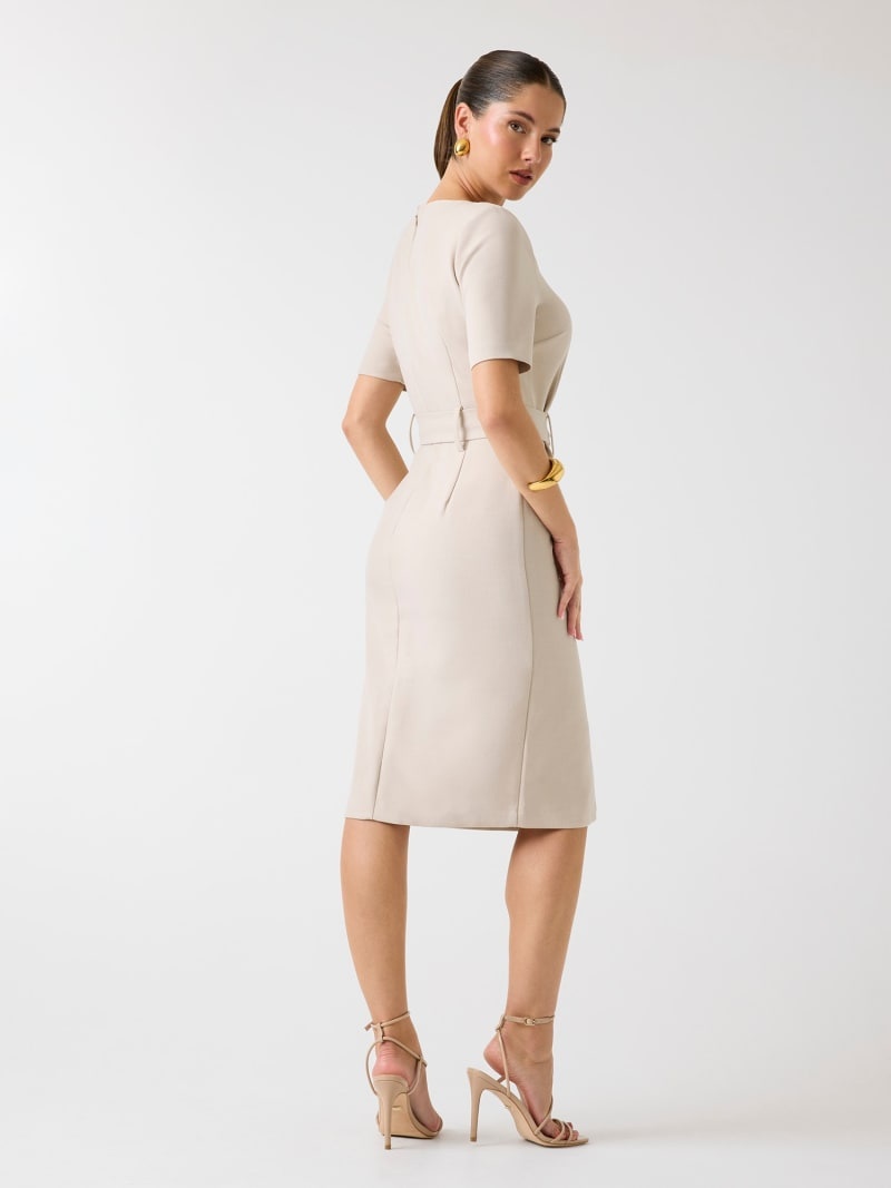 • Abito midi aderente in misto viscosa elasticizzata.• Scollo a barca aderente.• Vita aderente con cintura coordinata.• Maniche a tre quarti.• Chiusura con cerniera sul retro.