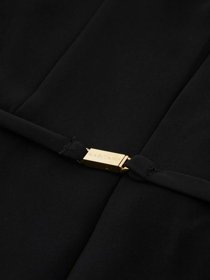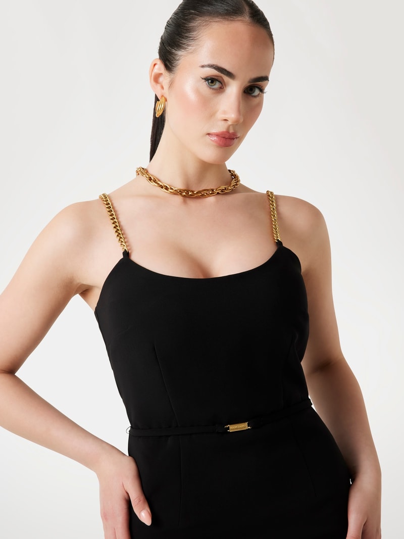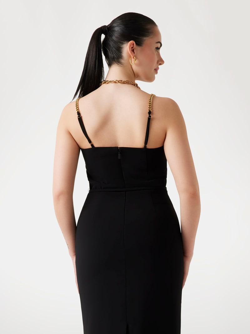 Vestito bodycon midi in tessuto stretch.Senza maniche, con spalline sottili a catena.Cintura sottile coordinata con fibbia con logo dorato.Chiusura posteriore con zip.