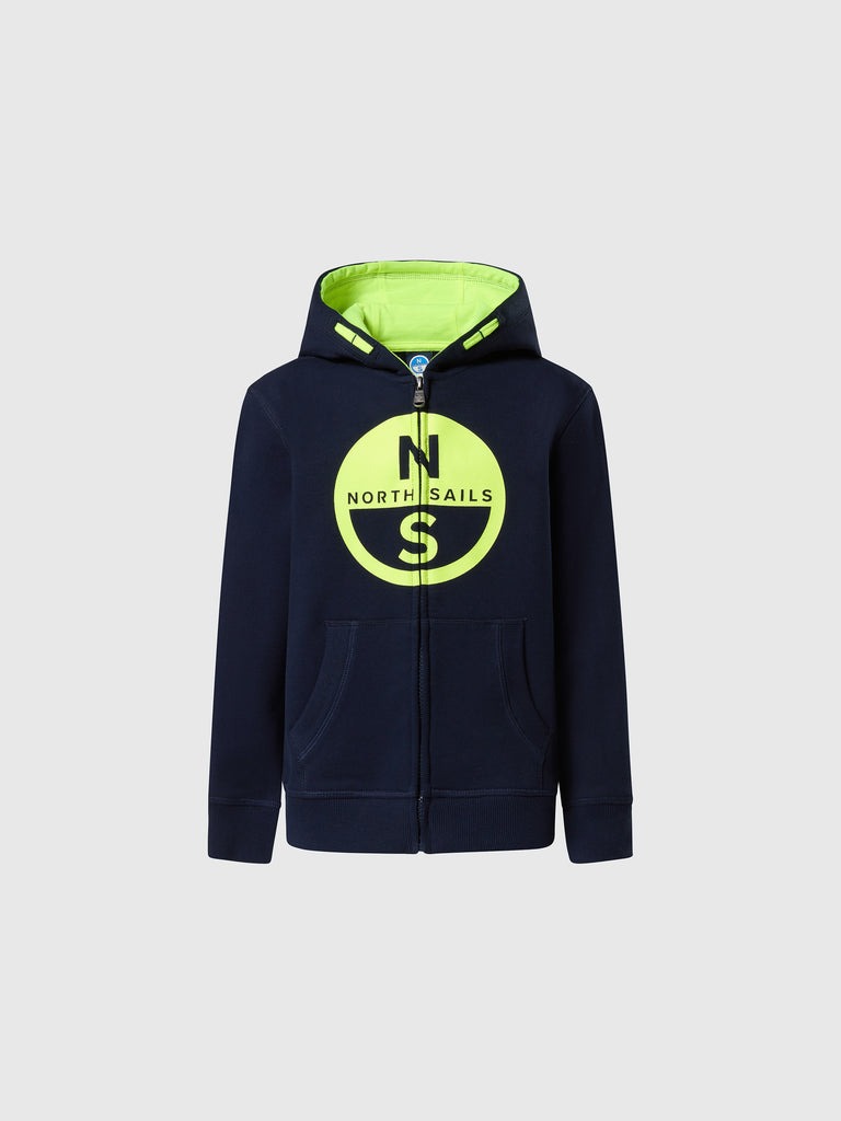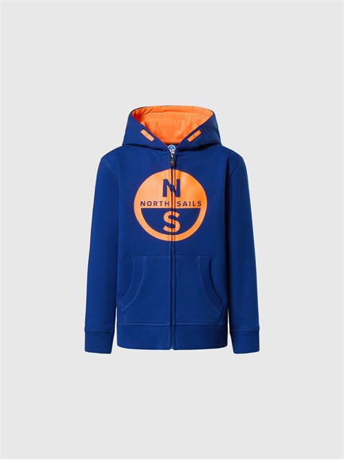 Realizzato in felpa di cotone organicoCappuccio con fodera in jersey a contrastoChiusura con zipTasche a marsupioPolsini e fondo a costineMaxi stampa North Sails