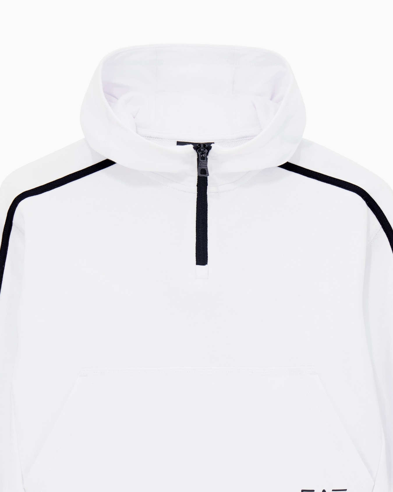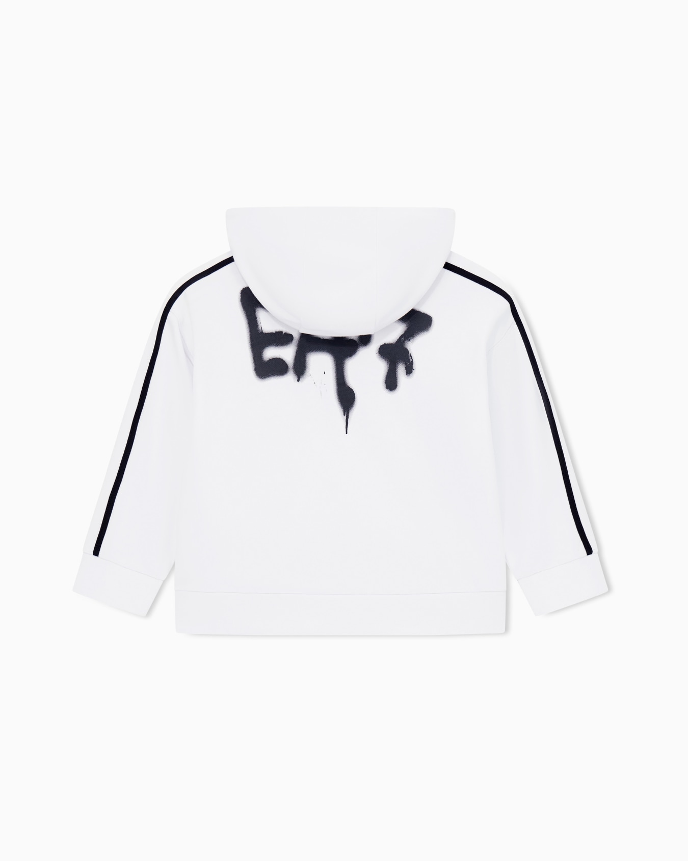 La particolare stampa effetto graffiti aggiunge un tocco grintoso a questa felpa con cappuccio realizzata in misto cotone organico. Il modello provvisto di chiusura con zip a 3/4 e pratica tasca a marsupio, è perfetto per accompagnare look dedicati al tempo libero, la scuola e lo sport. Il logo EA7 è il vero protagonista della proposta Logo Series, che in questa stagione si declina in diverse animazioni: tono su tono, grafiche retrò e formati mini. Capi dal fit confortevole e versatile, perfetti per vestire momenti di relax e svago.