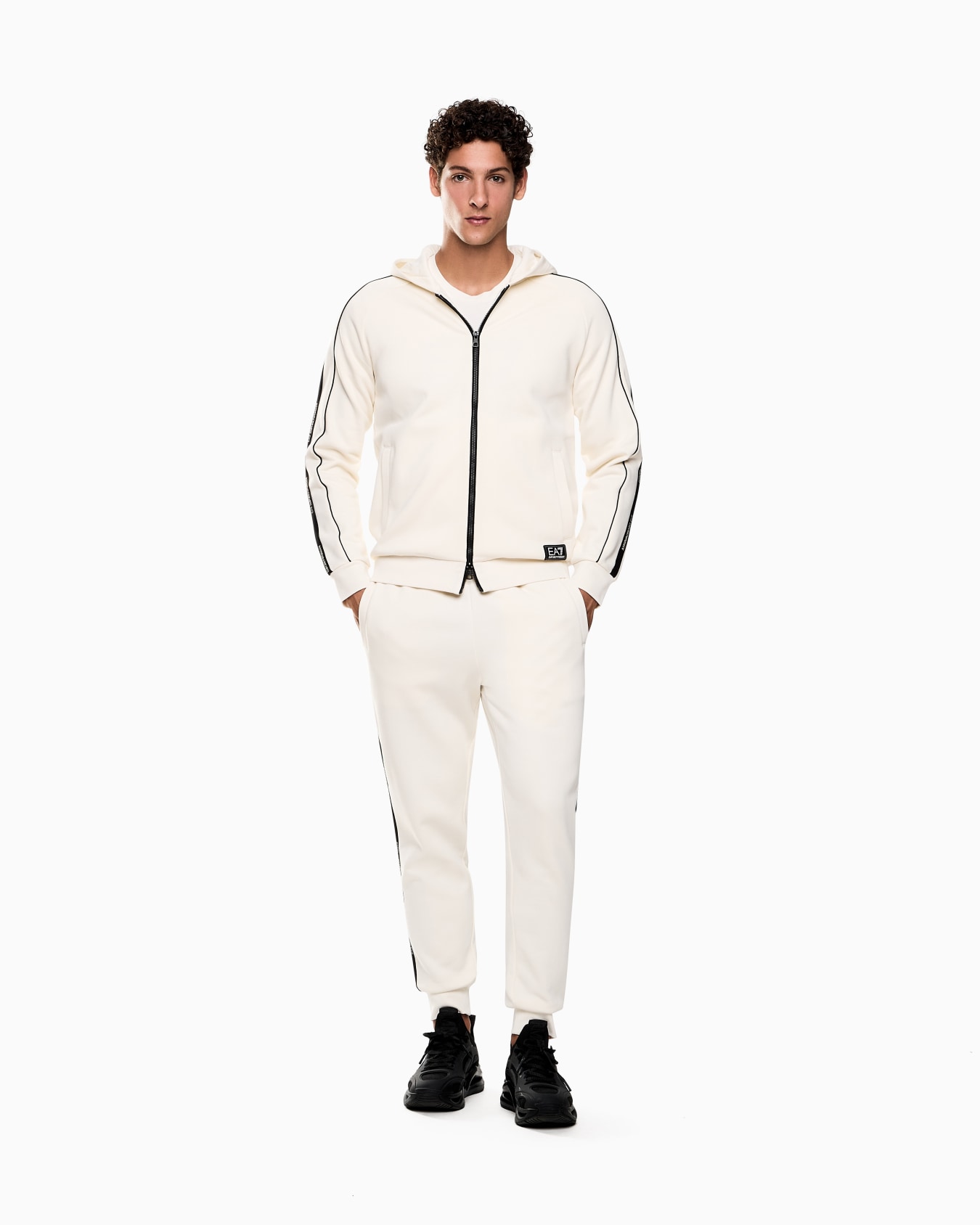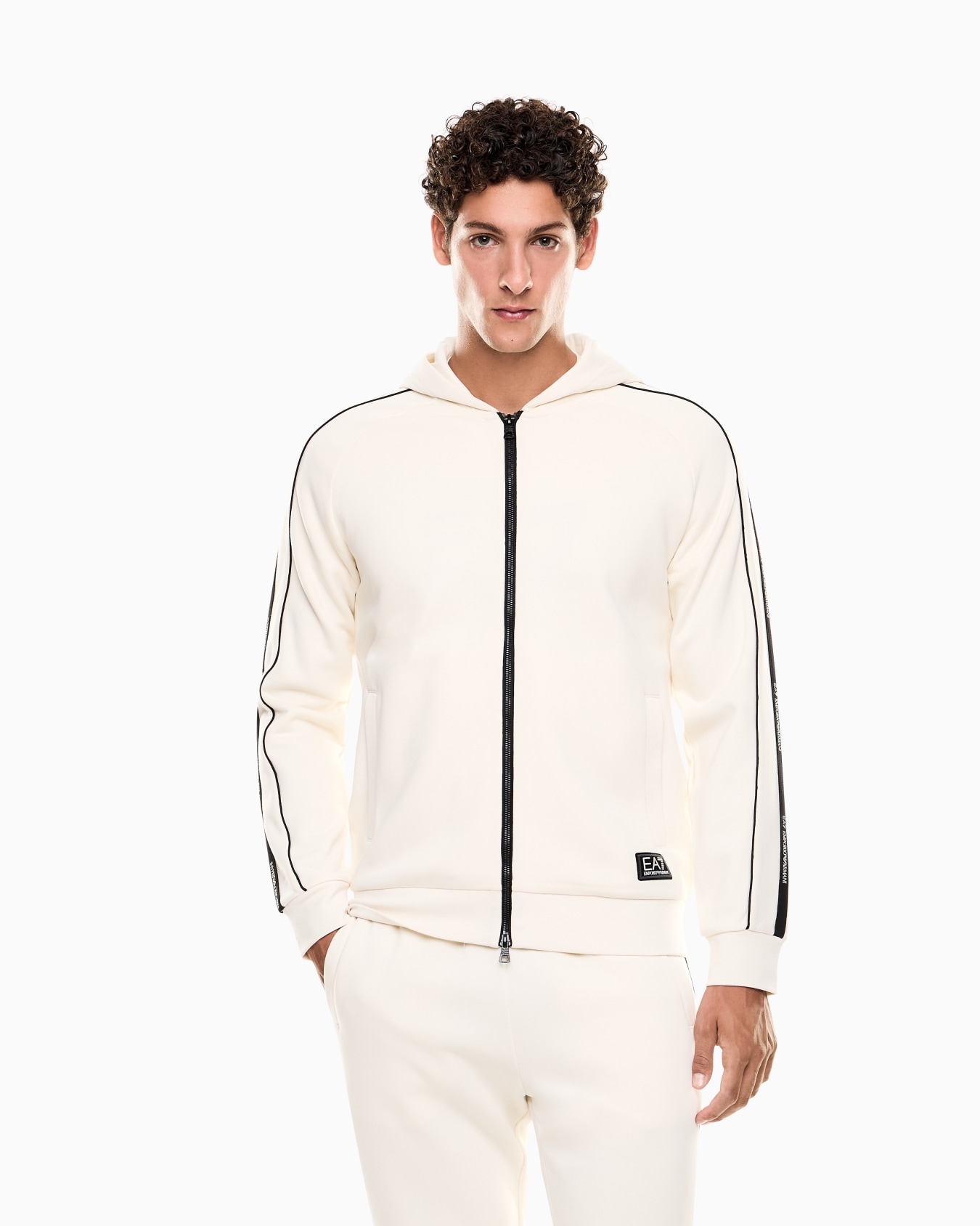 Felpa con cappuccio e chiusura full zip realizzata in misto cotone, dalla vestibilità regular. Il modello è personalizzato dal dettaglio con logo tape sulle spalle e dal logo EA7 sul petto, che riprende altri creazioni della linea Logo Series.
