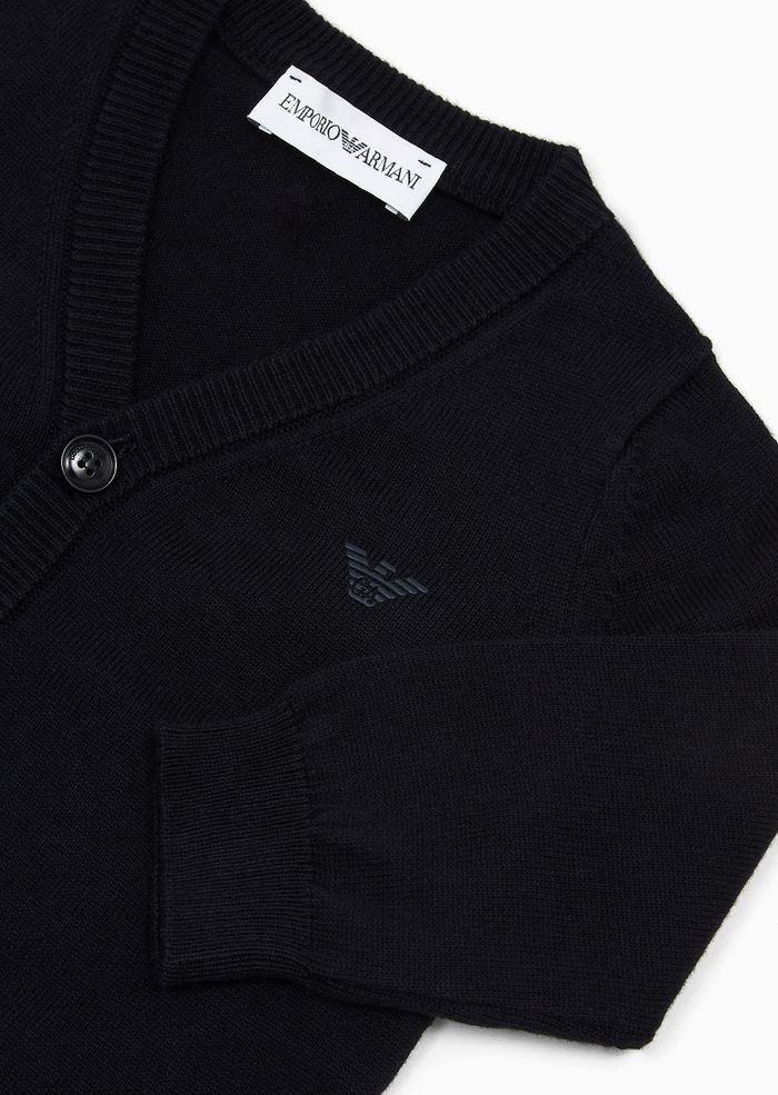 I capi della linea Essential si caratterizzano per il loro design pulito nelle forme e nei colori, per adattarsi in maniera naturale al guardaroba dei più piccoli in qualsiasi stagione dell'anno. Cardigan scollo a V in maglia rasata misto lana vergine e cotone con chiusura frontale a bottoni. Micro aquila ricamata sul petto.