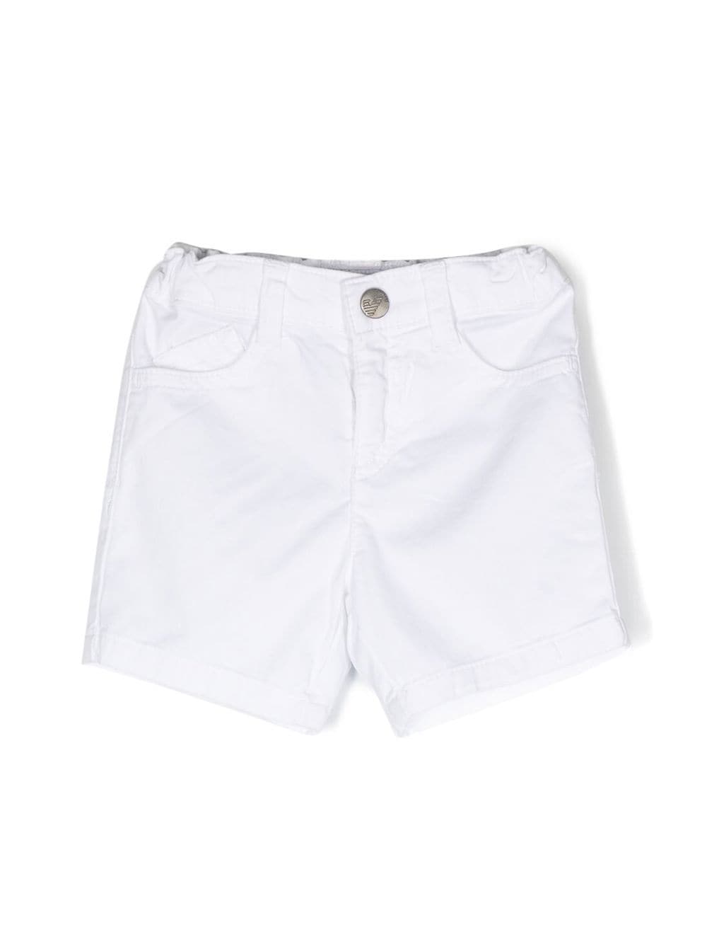 Bermuda in cotone, chiusura con zip e bottone, cinque tasche, targhetta logo cucita sul retro, elastico interno regolabile in vita