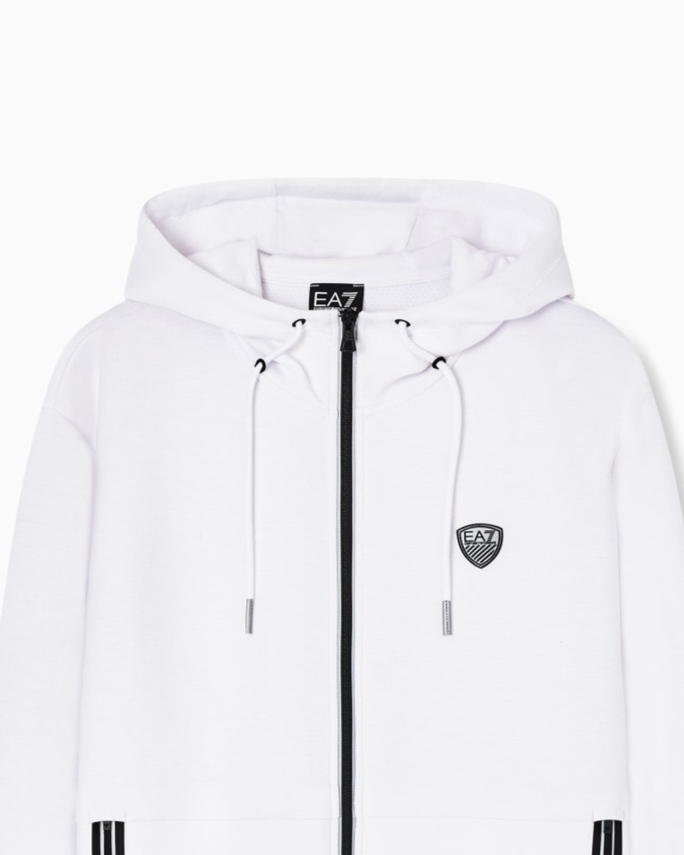 Felpa con cappuccio realizzata in misto viscosa stretch, dalla vestibilità confortevole. Il modello presenta apertura con zip, due tasche laterali zippate e una personalizzazione con patch scudetto applicato sul petto. Un capo versatile ed essenziale, complemento ideale di numerosi look in chiave sportiva.