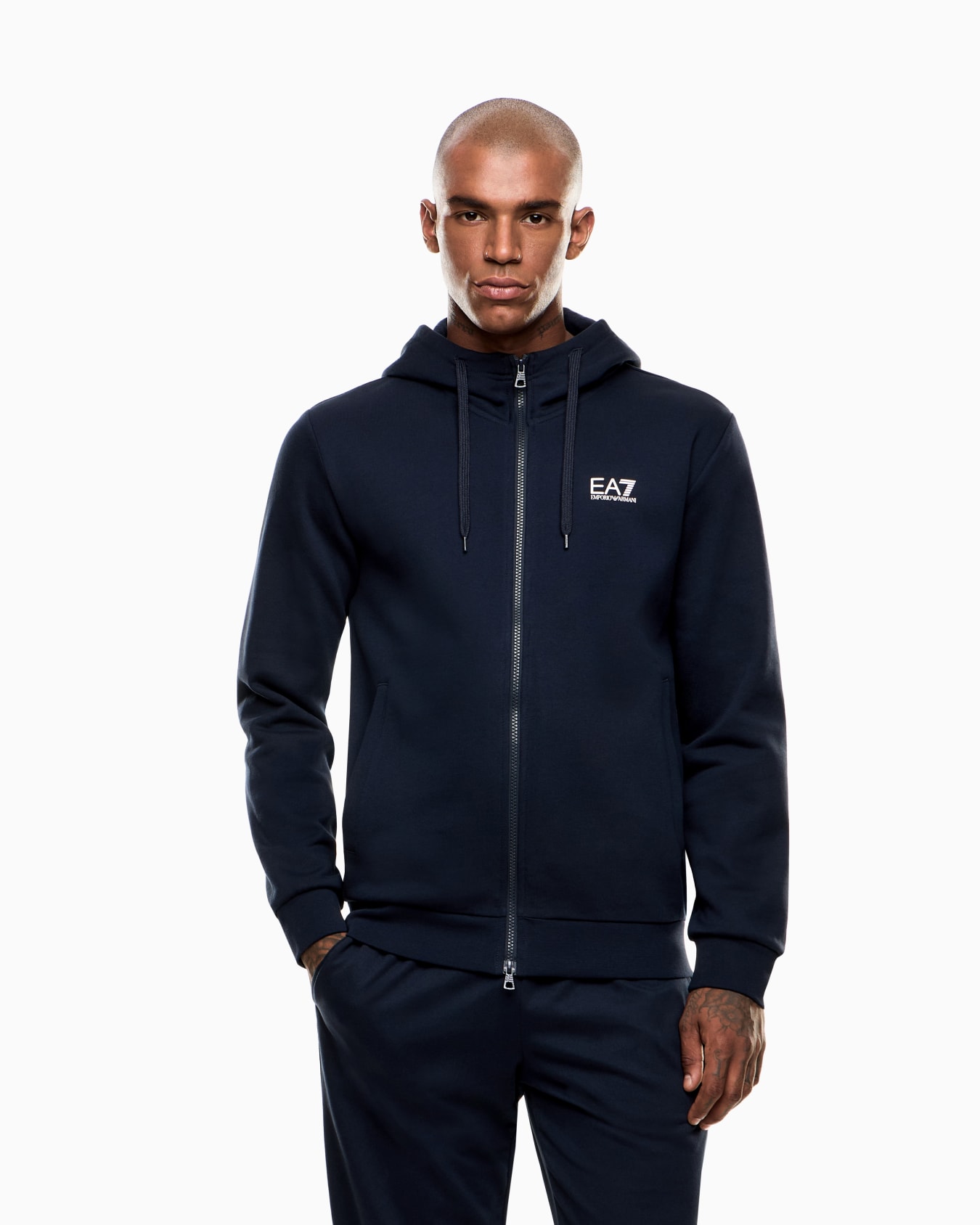 Completa i tuoi look sportivi con questa felpa con cappuccio e chiusura con zip dalla vestibilità confortevole. modello, realizzato in morbido misto cotone, presenta due tasche laterali, profili elasticizzati ed è personalizzata dal logo EA7 stampato a contrasto sul petto.
