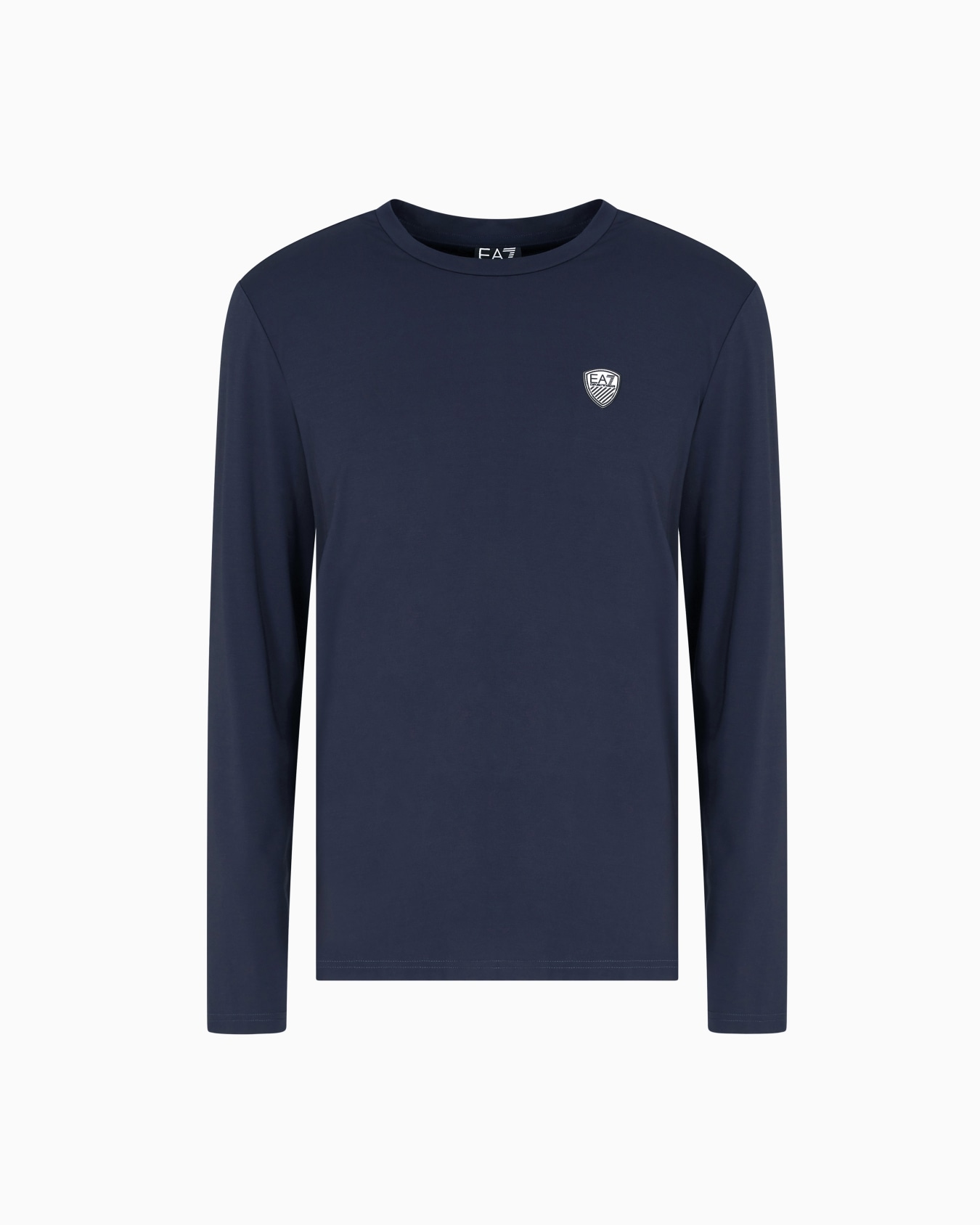 T-shirt girocollo a maniche lunghe realizzata in jersey di misto viscosa stretch, impreziosita dal logo a scudo EA7 dal finish metallizzato. Un capo versatile e confortevole, perfetto complemento di look sportivi.