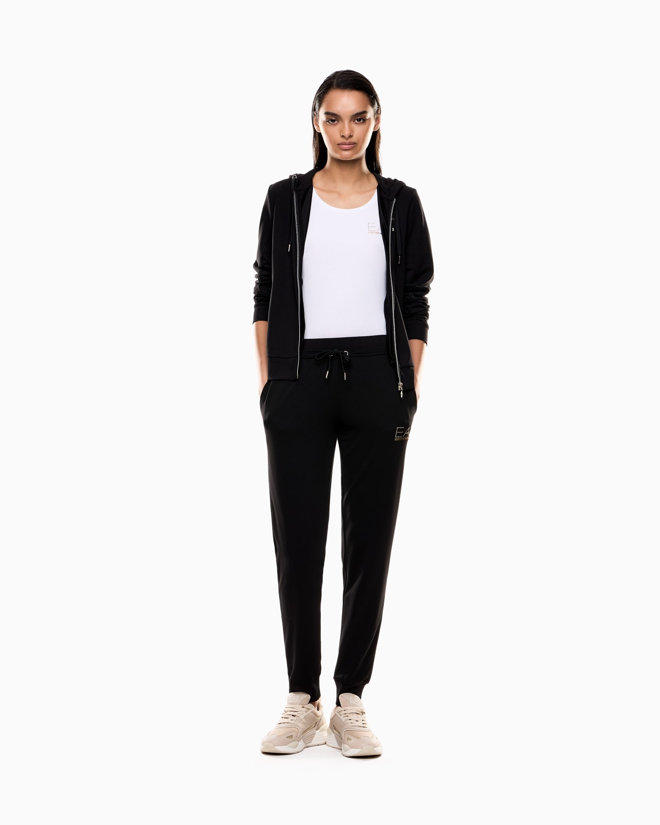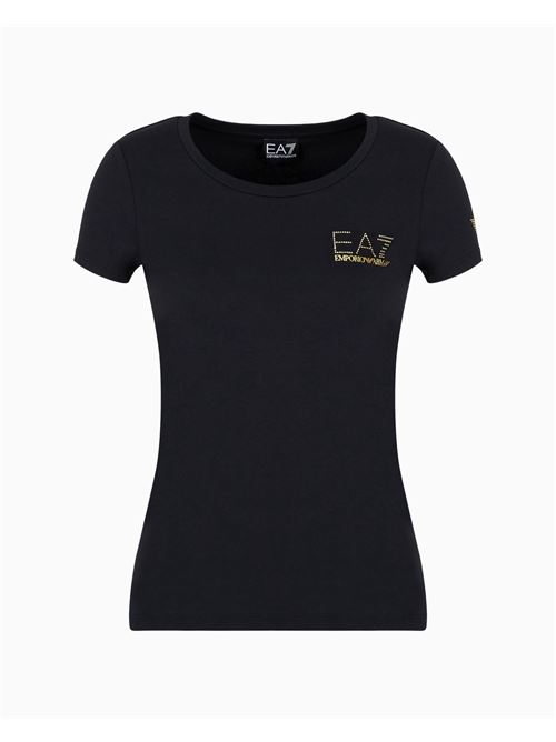 T-shirt girocollo versatile e comoda, realizzata in tessuto misto cotone e modal stretch, dalla vestibilità slim, pensata per completare il tuo look sporty con un tocco luminoso. Un modello che si distingue per la personalizzazione del logo EA7 sul petto e dal logo Eagle sulla manica sinistra, entrambi realizzati in micro borchie oro che donano un tocco luminoso, che richiama sia i pantaloni che le felpe della stessa linea.