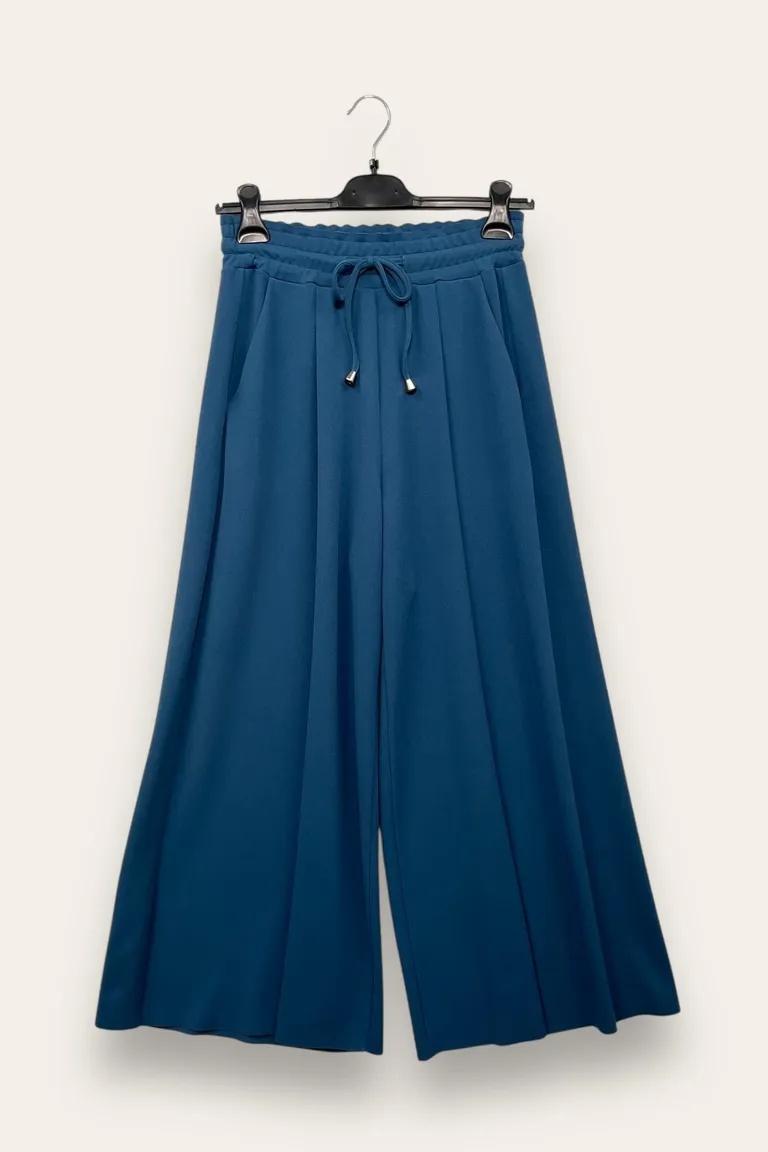 Pantalone in crêpe a gamba larga, elastico e coulisse in vita