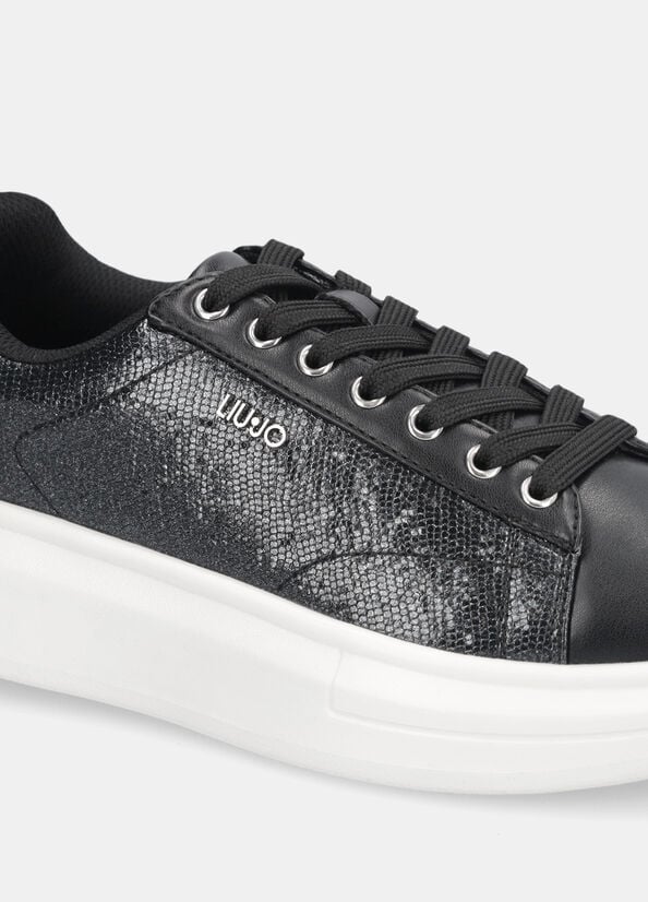 Sneakers con tomaia lucida effetto lizard Inserto effetto laminato Logo lettering applicato Lacci piatti Suola bold