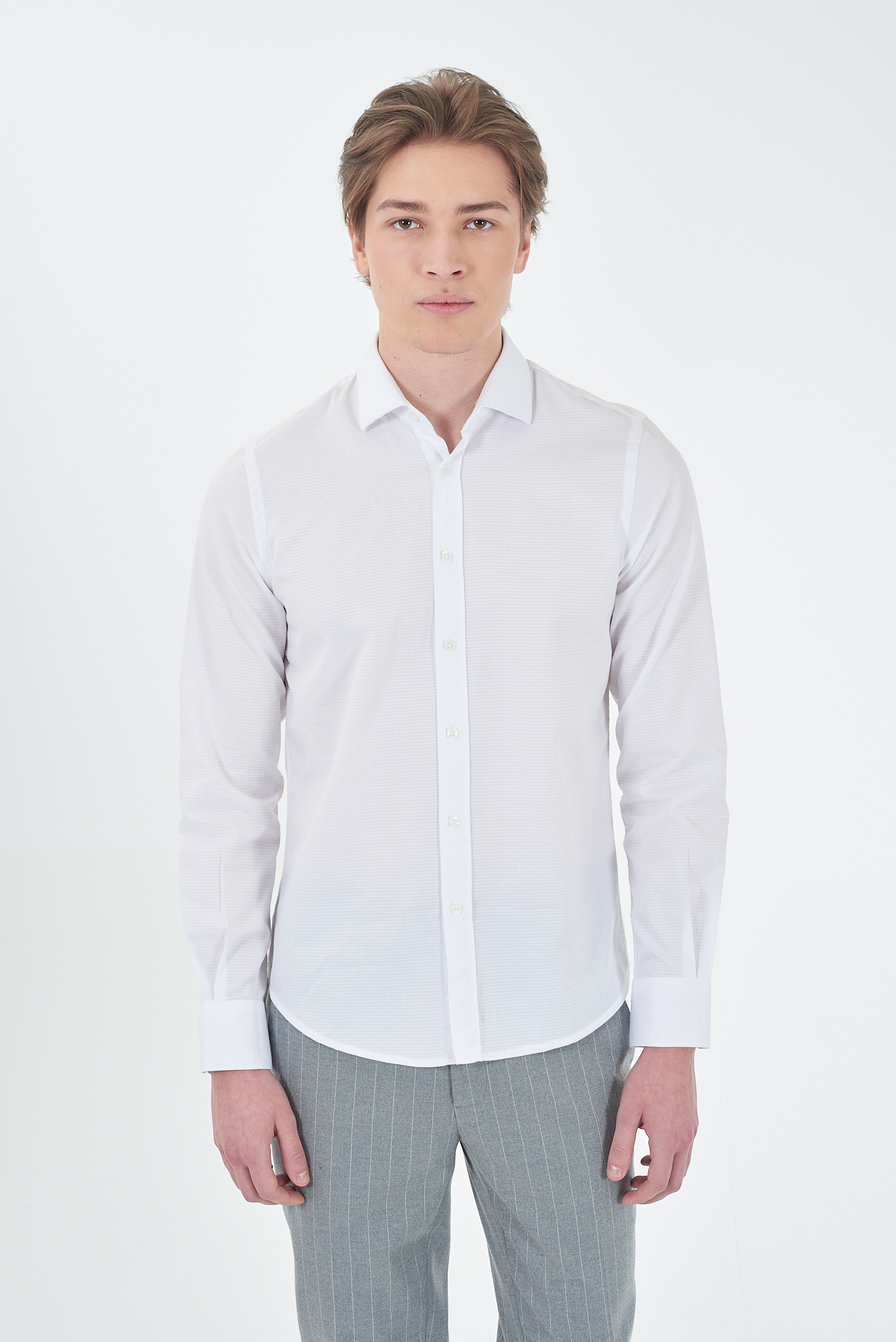 * Camicia in cotone.* Colletto classico.* Chiusura con bottoni.* Maniche lunghe con polsini a due bottoni.* Orlo arrotondato.