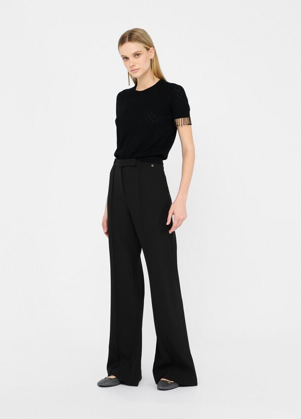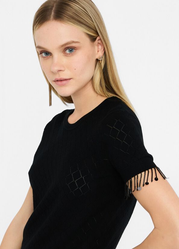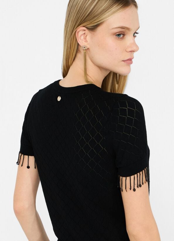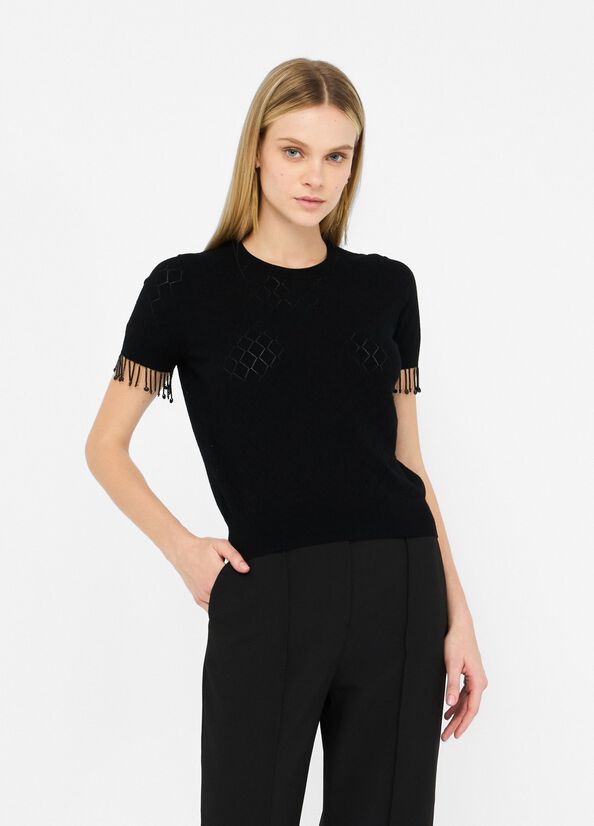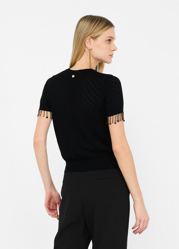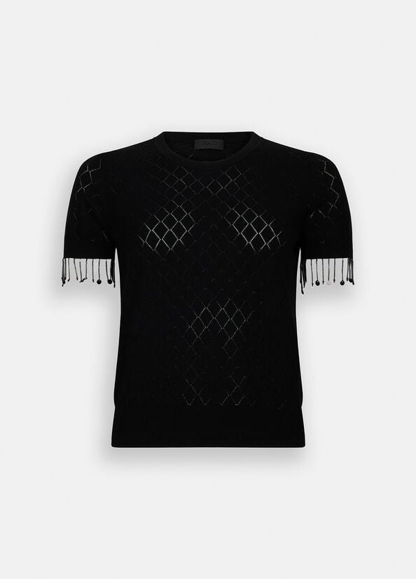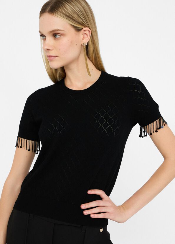 T-shirt in maglia di misto viscosaLavorazione a rombi punzonataTaglio girocolloManiche corteFrange con perlineBordi a costineLogo in metallo sul retroProdotto "Liu Jo Better"
