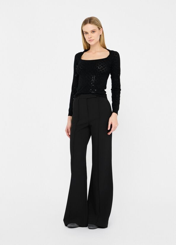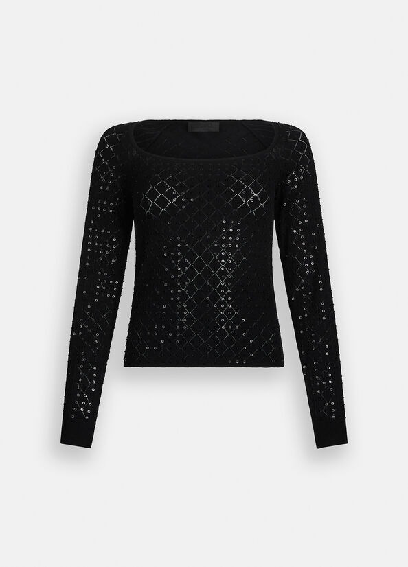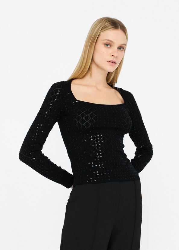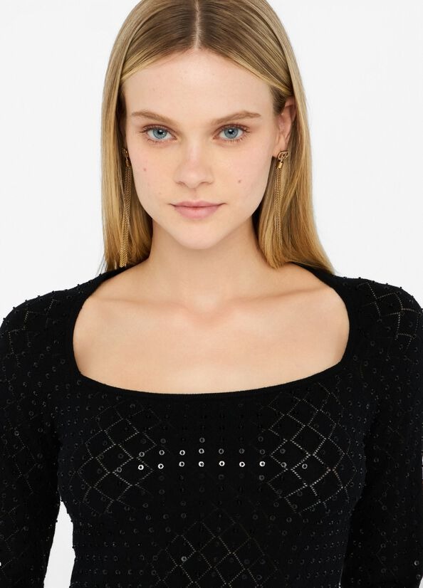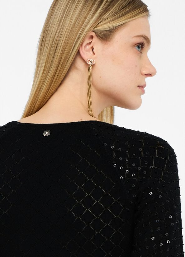 Maglia in misto viscosaLavorazione a rombi punzonataPaillettes applicateScollo rotondoManiche lungheBordi a costineLogo in metallo sul retroProdotto "Liu Jo Better"