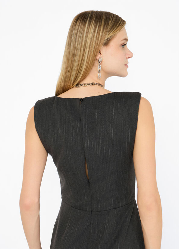 Abito midi in misto viscosa stretchMotivo gessatoScollo a barcaBottone e goccia sul retroDrappeggioSpacco laterale con inserto in pizzoChiusura con zip invisibile sul retro