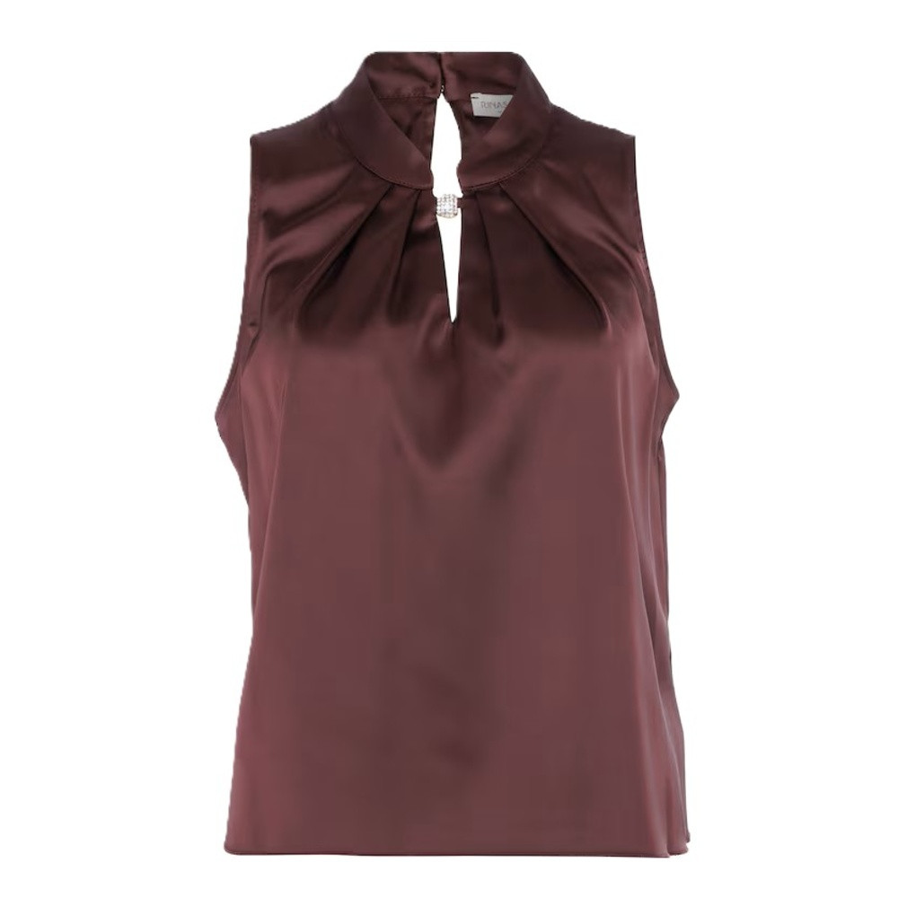 * Top senza maniche in tessuto satinato* Collo alto con dettaglio centrale gioiello* Piccolo scollo a goccia frontale* Linea morbida e leggermente svasata* Chiusura posteriore con bottone* Capo elegante e luminoso