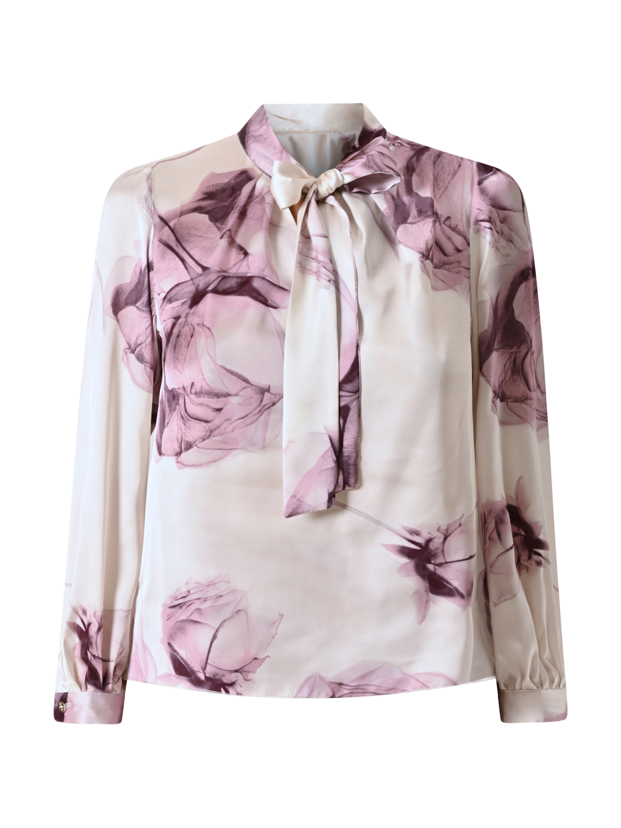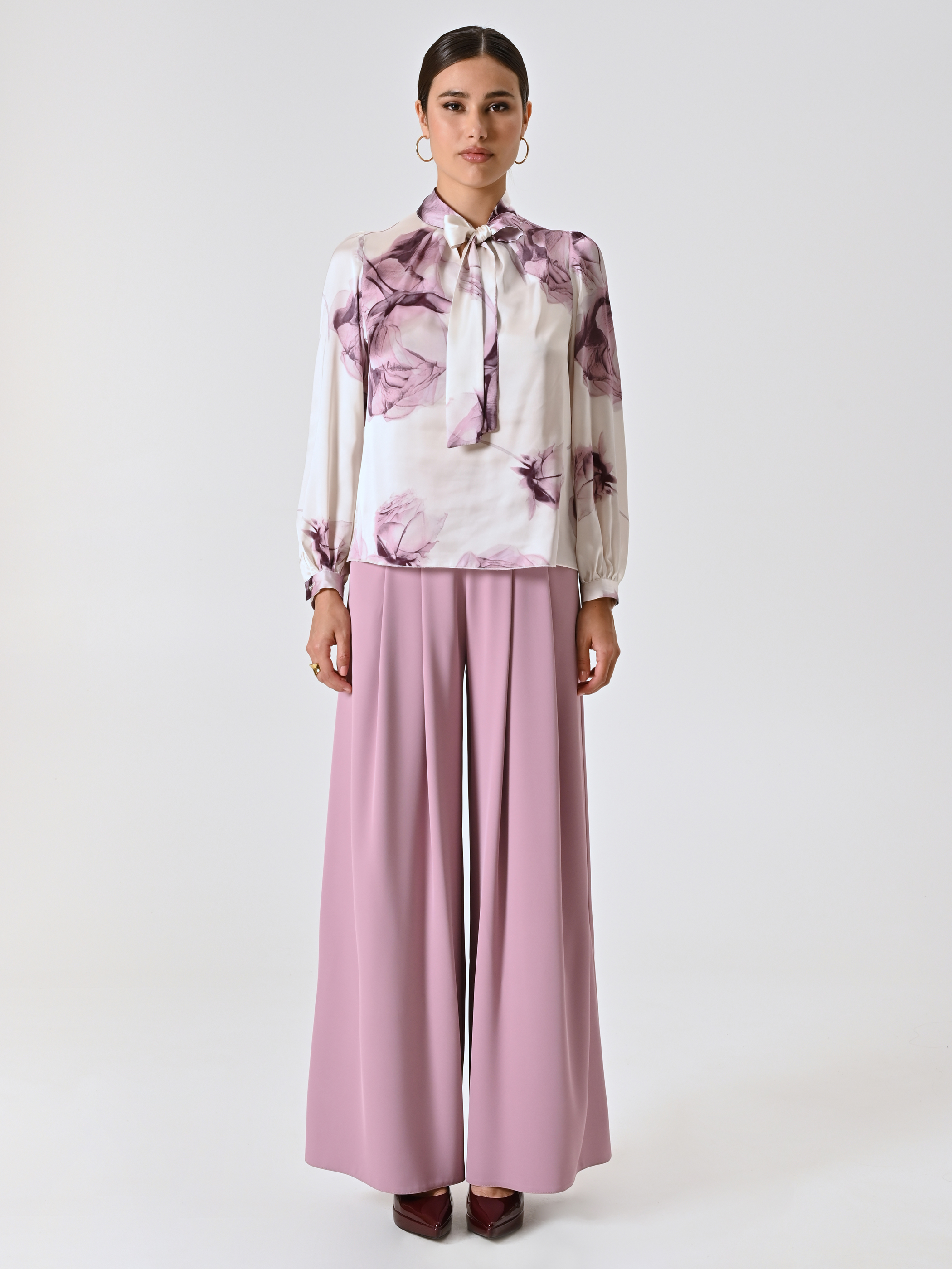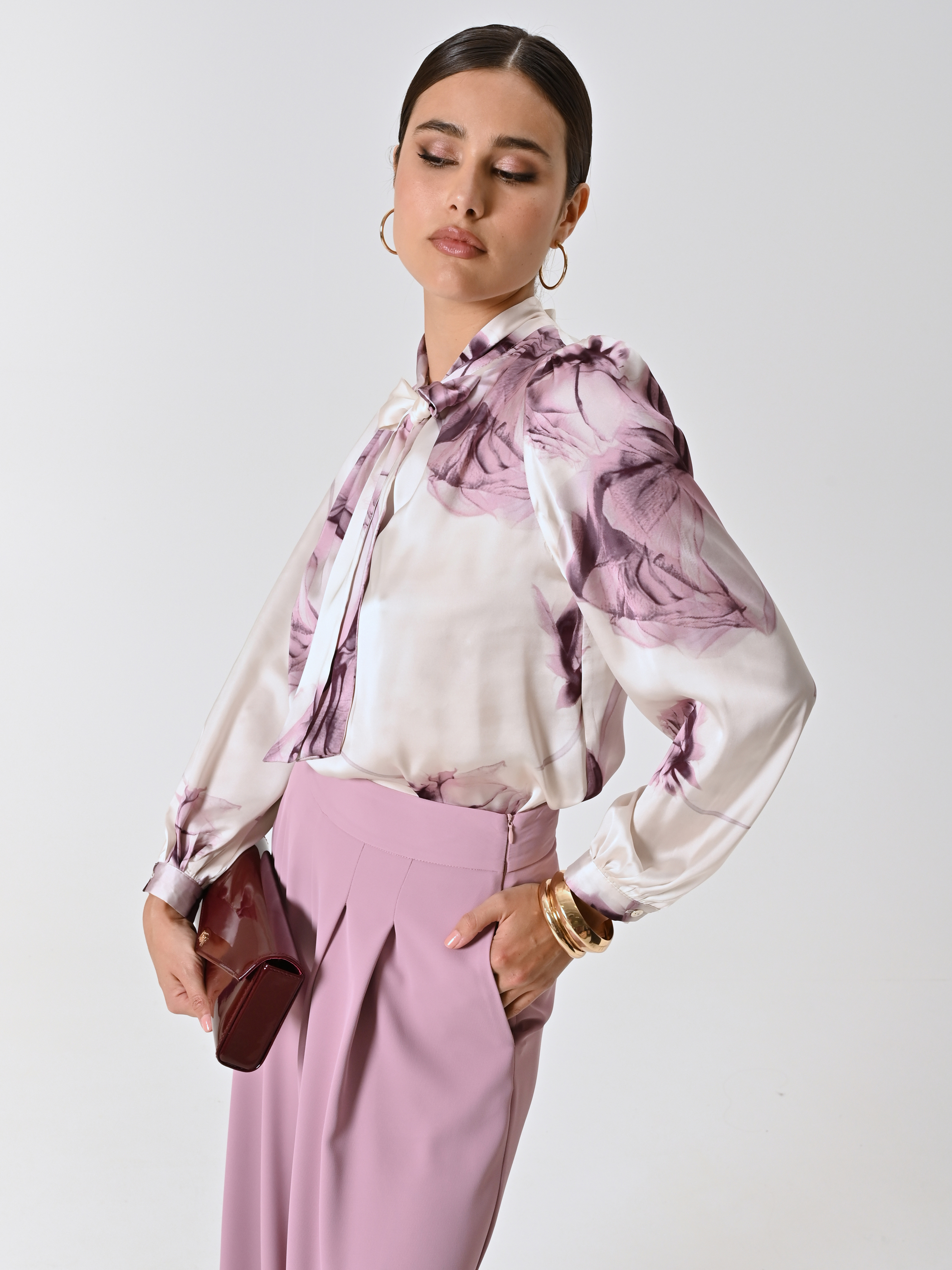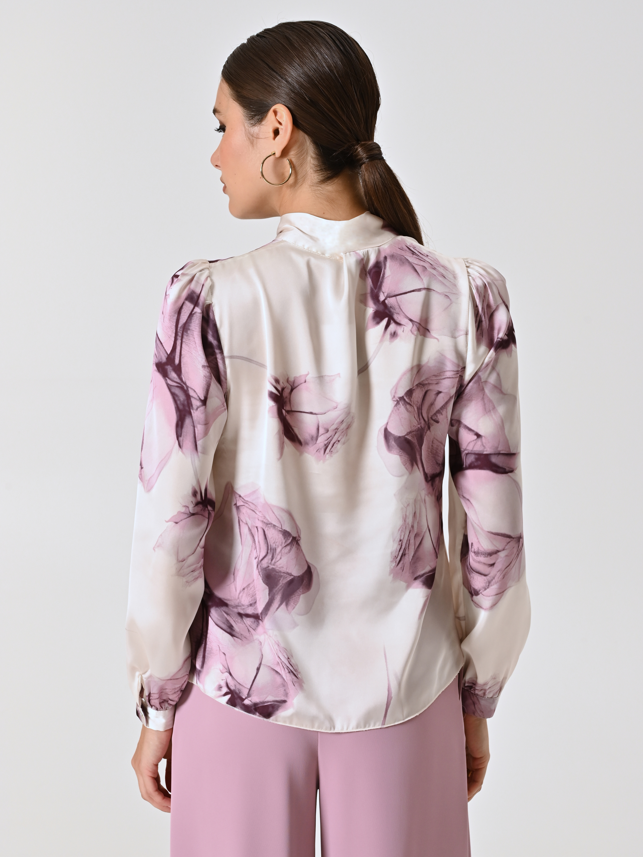 Blusa stampa Floreale Rosa Malva, un capo romantico e delicato che esprime tutta la femminilità di un look elegante da cerimonia.