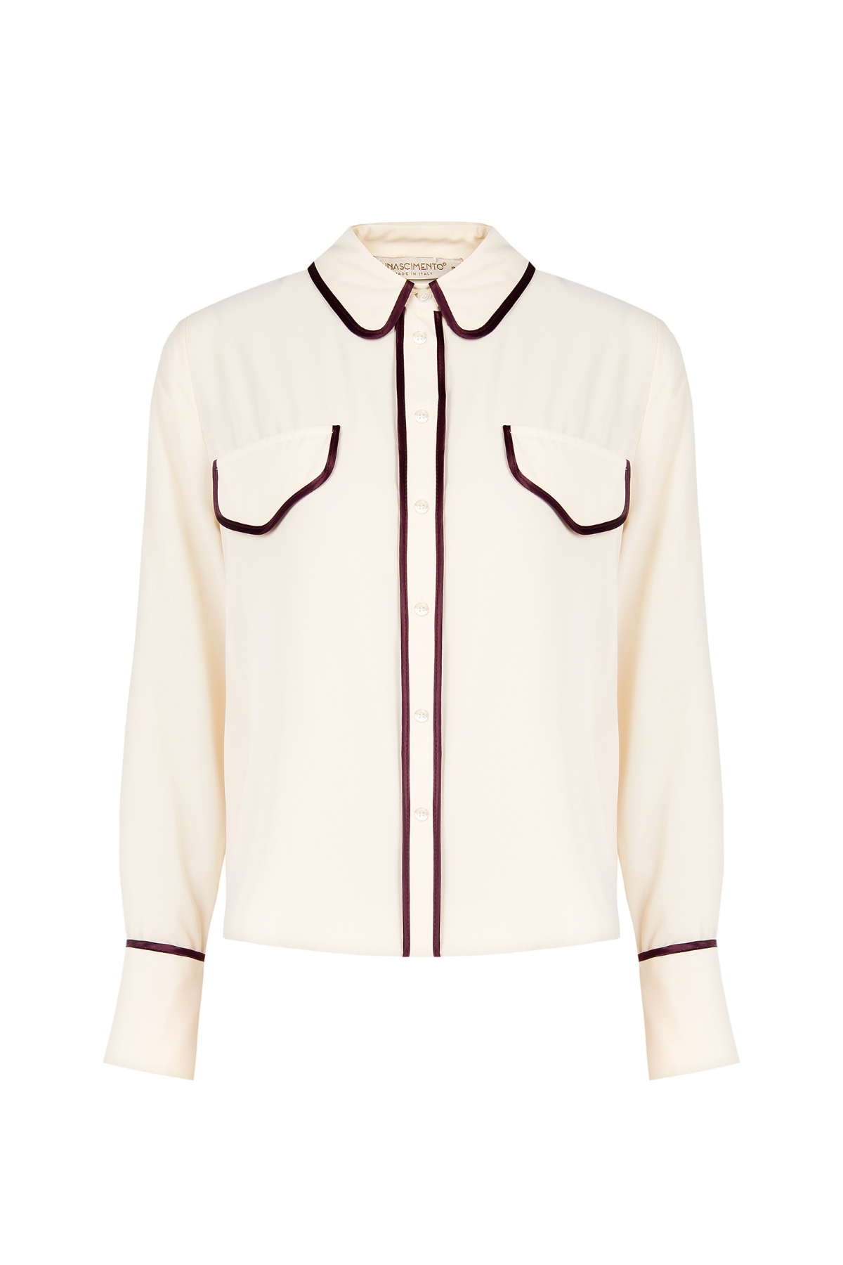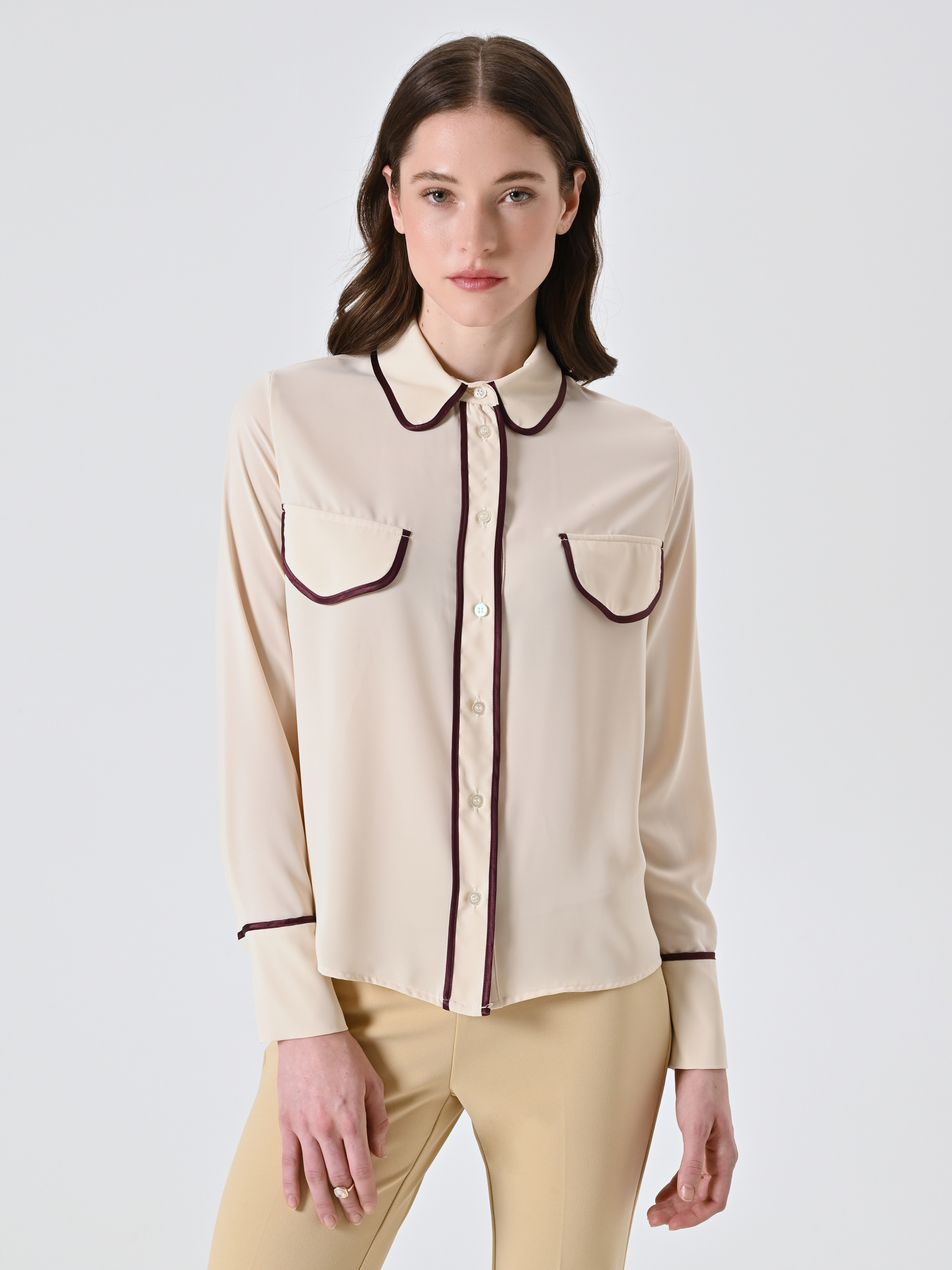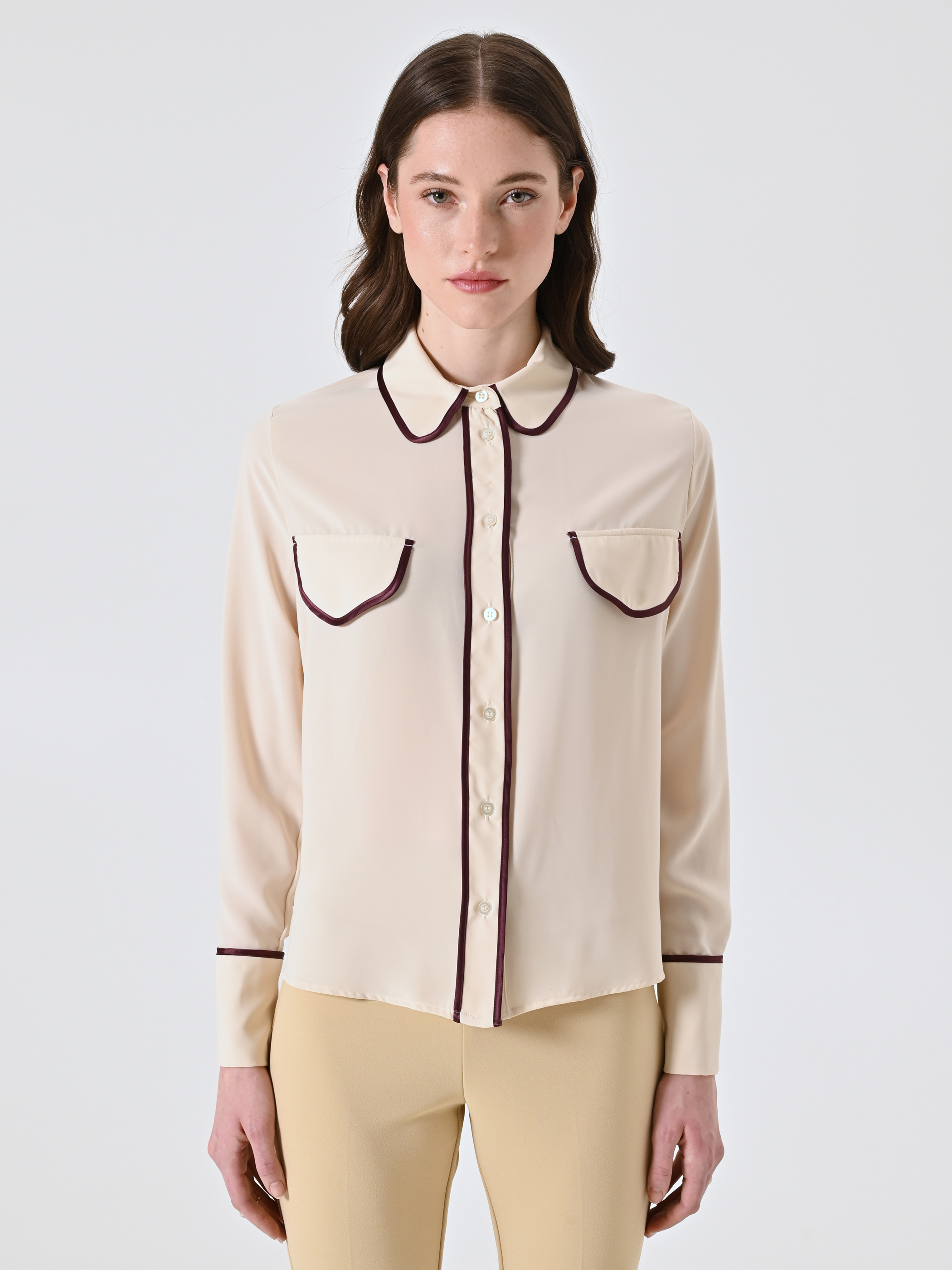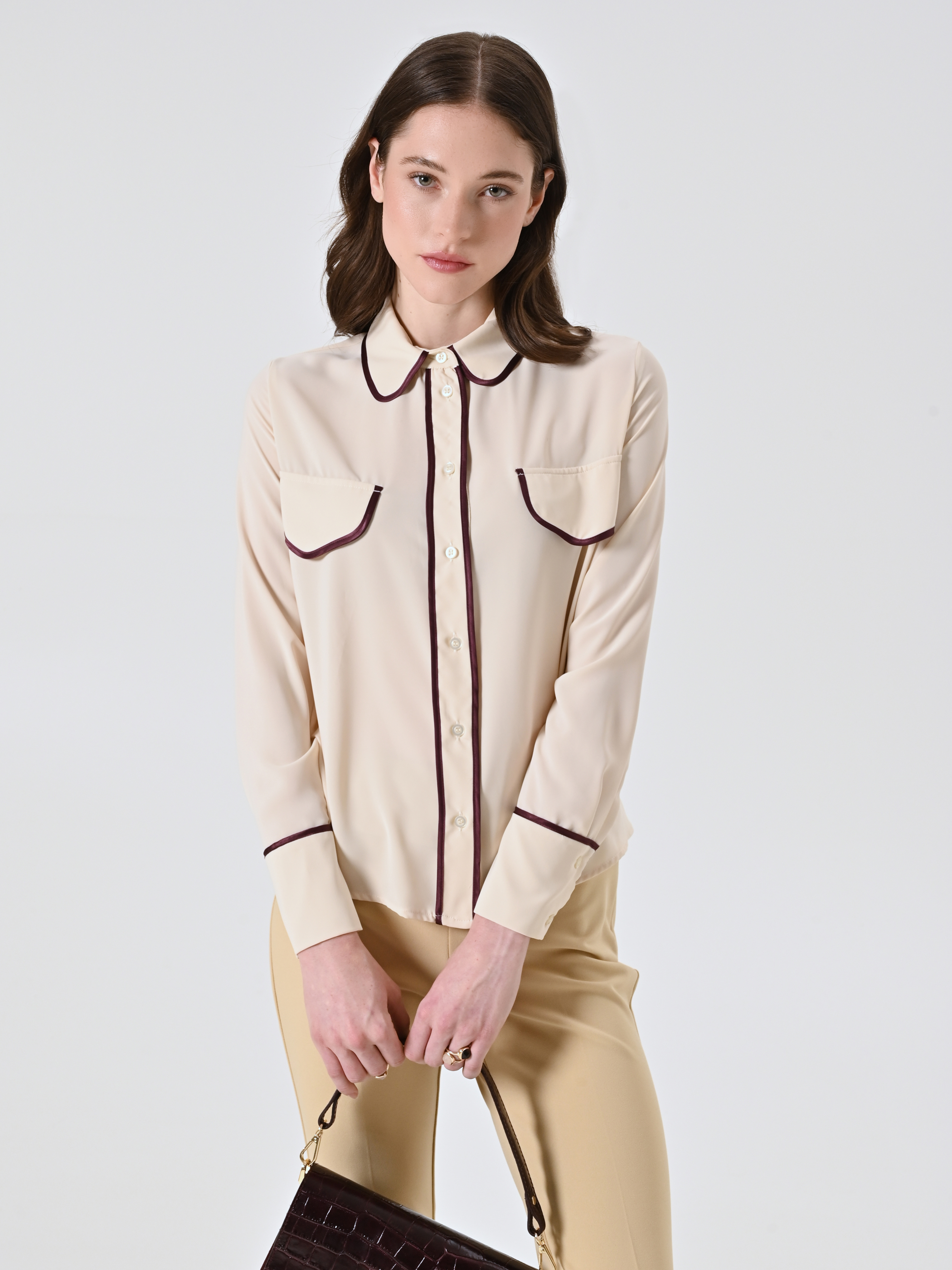 La Camicia con Piping Bordeaux è una proposta elegante e contemporanea, pensata per aggiungere un tocco sofisticato ai tuoi look da ufficio.